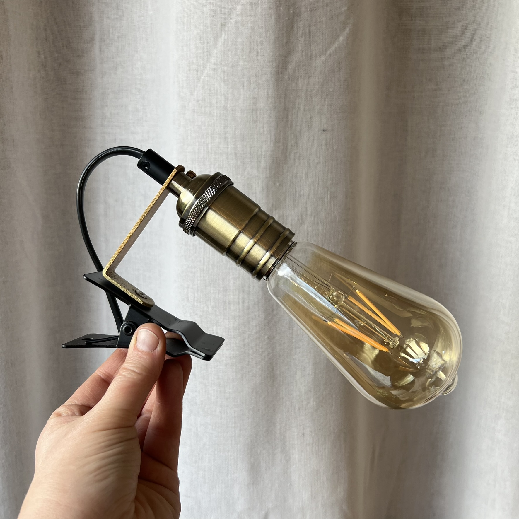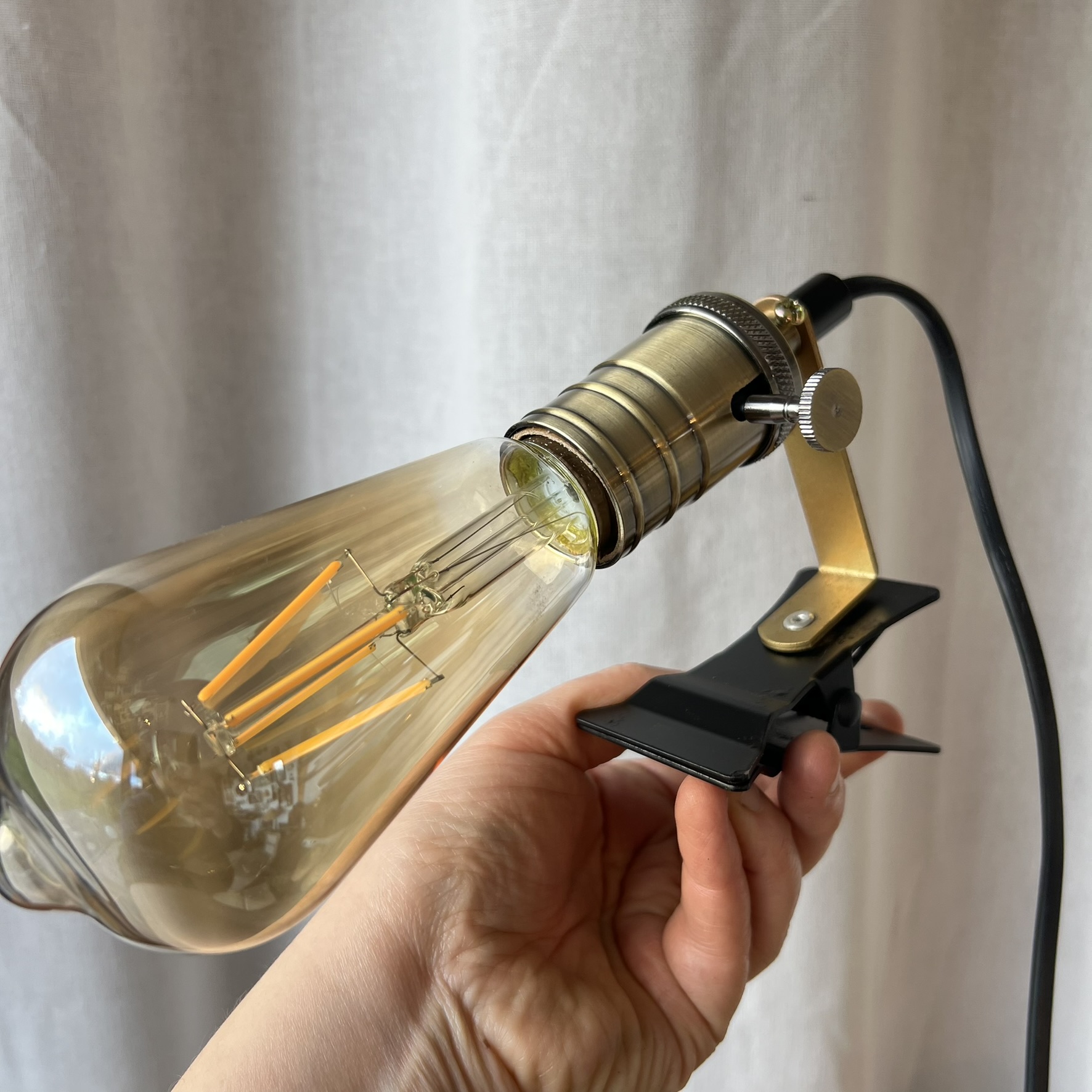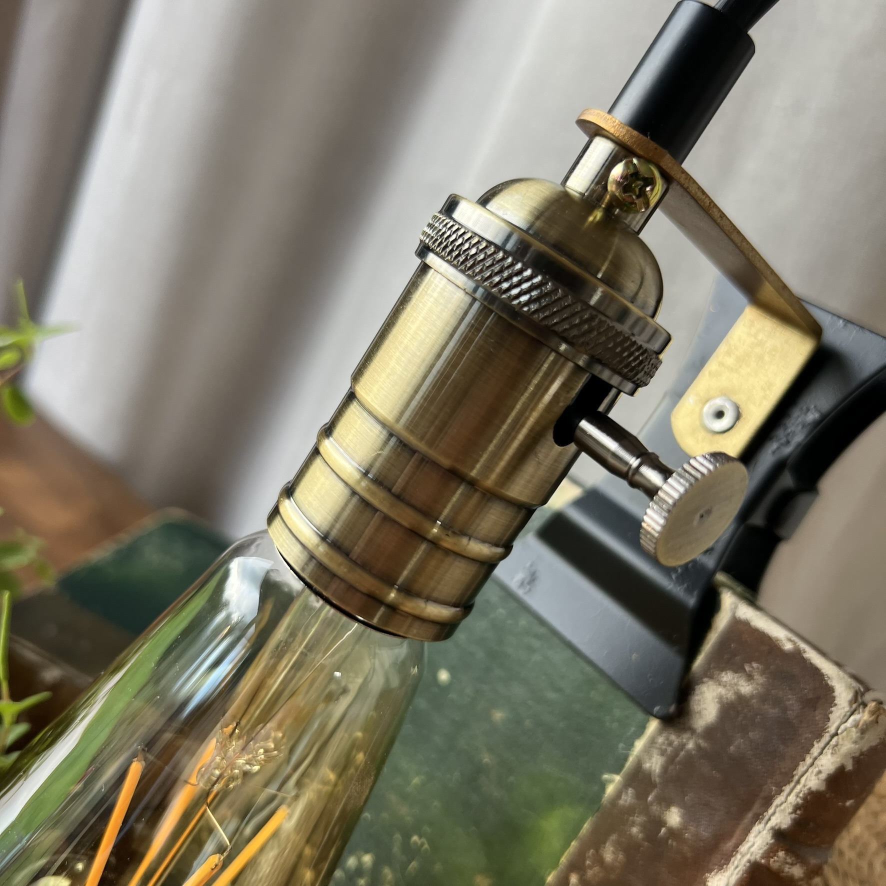 J’ai installé une douille en métal doré avec molette intégrée, qui permet d’allumer et d’éteindre la lampe directement sur la douille. Une ampoule style industriel neuve est offerte avec.