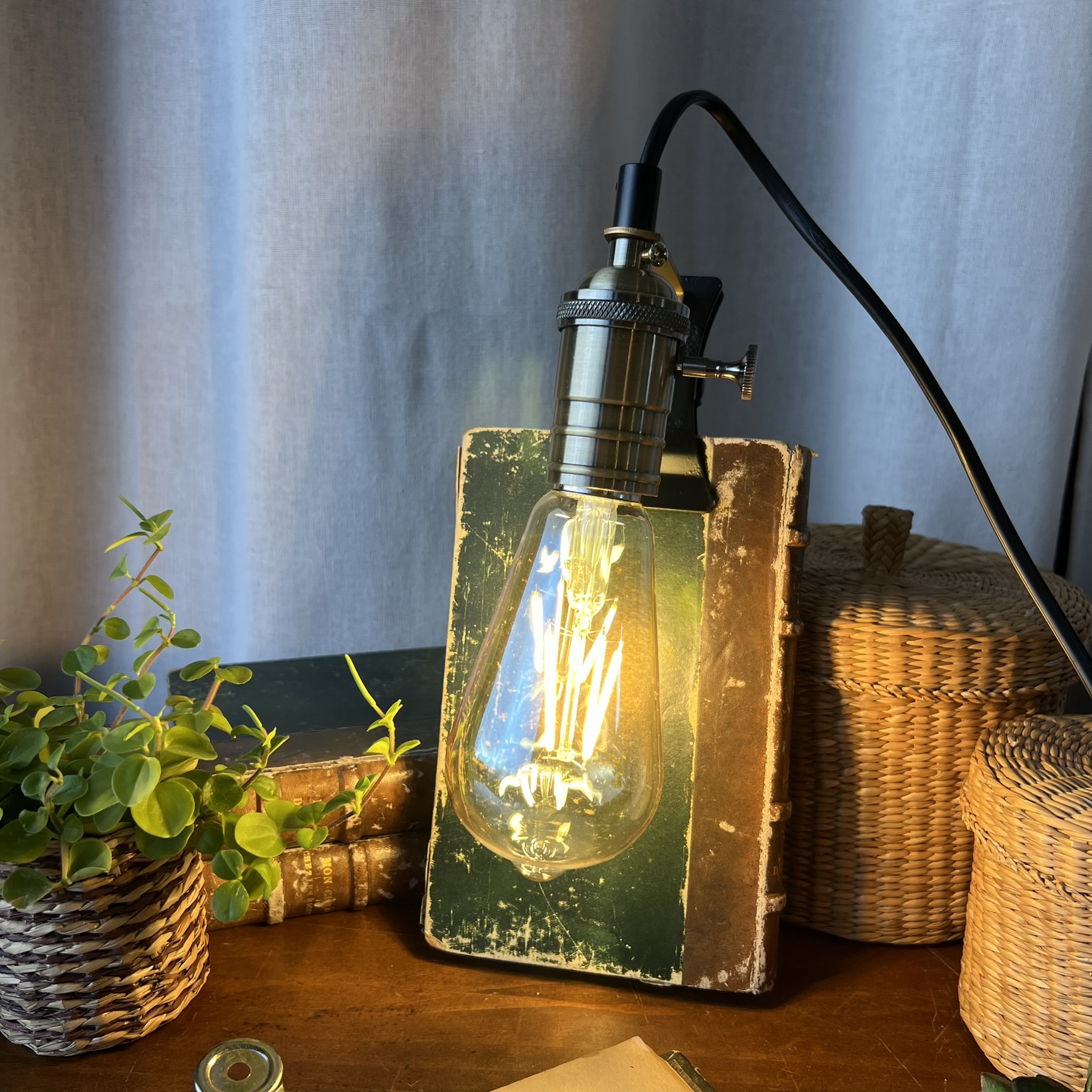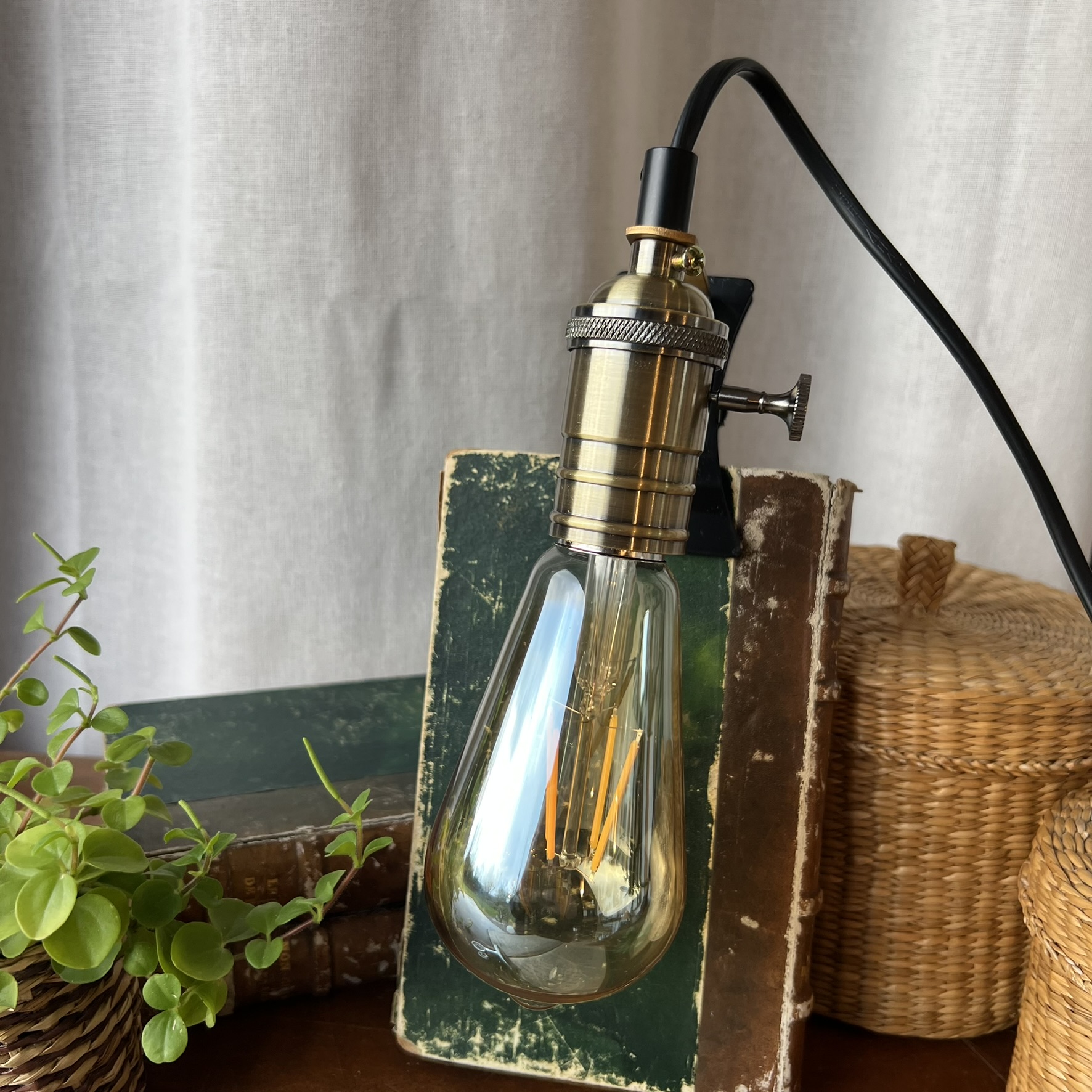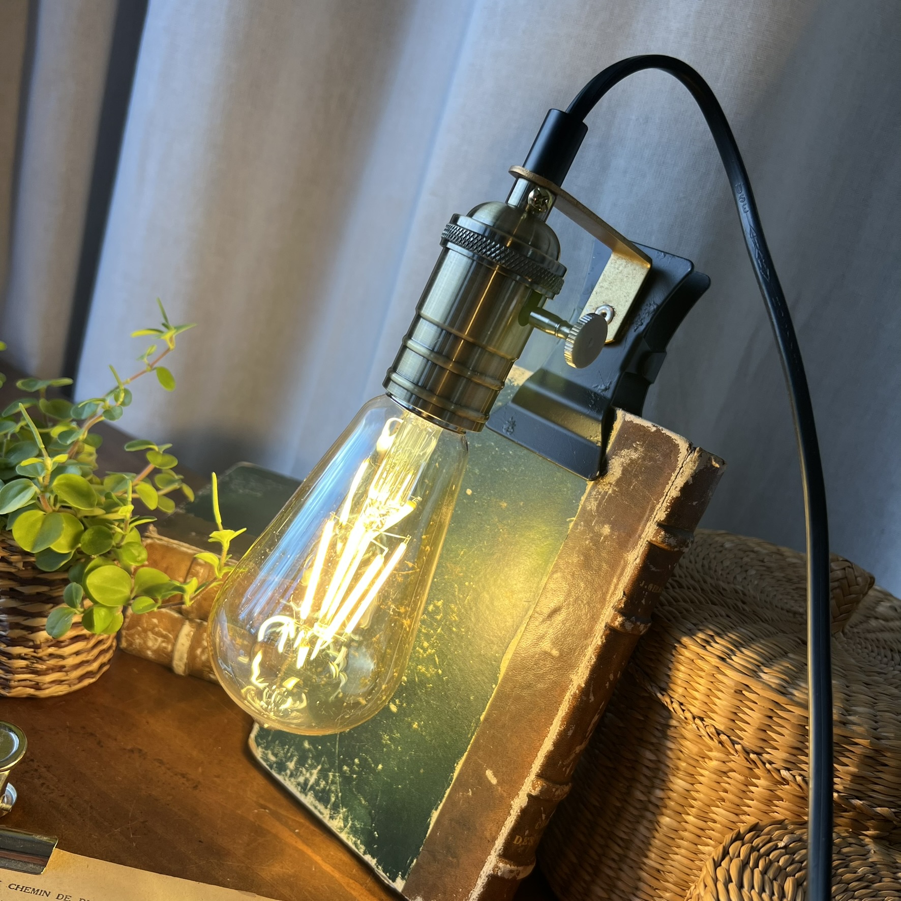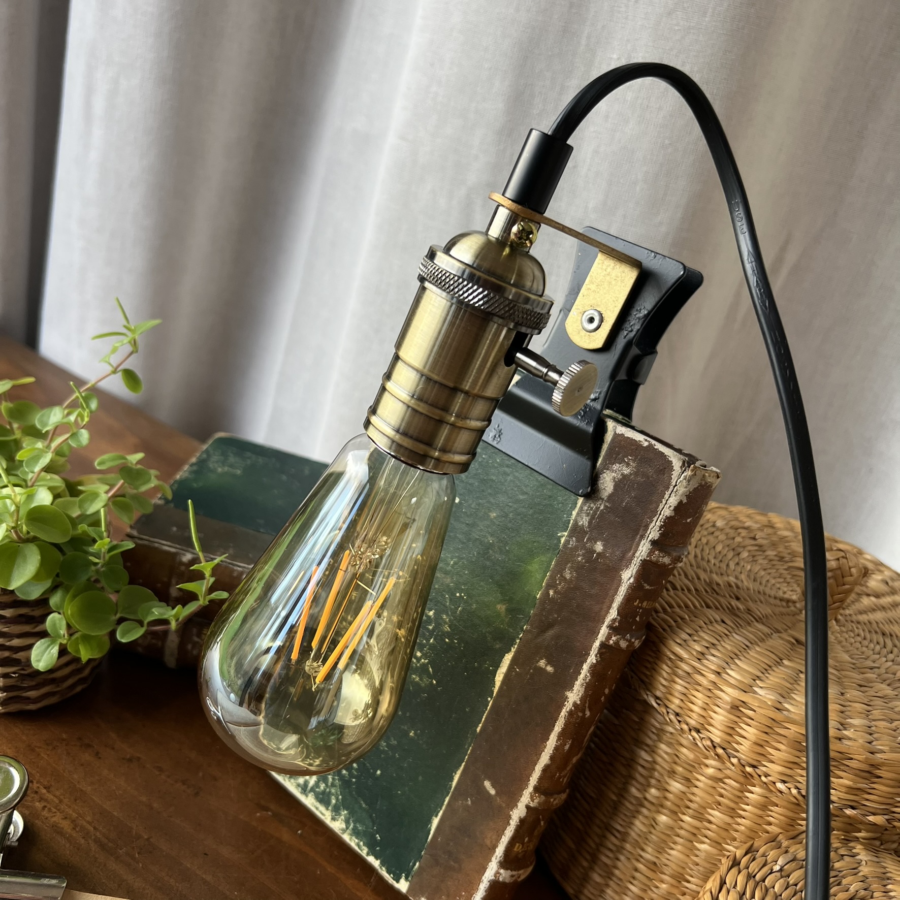 J’ai installé une douille en métal doré avec molette intégrée, qui permet d’allumer et d’éteindre la lampe directement sur la douille. Une ampoule style industriel neuve est offerte avec.