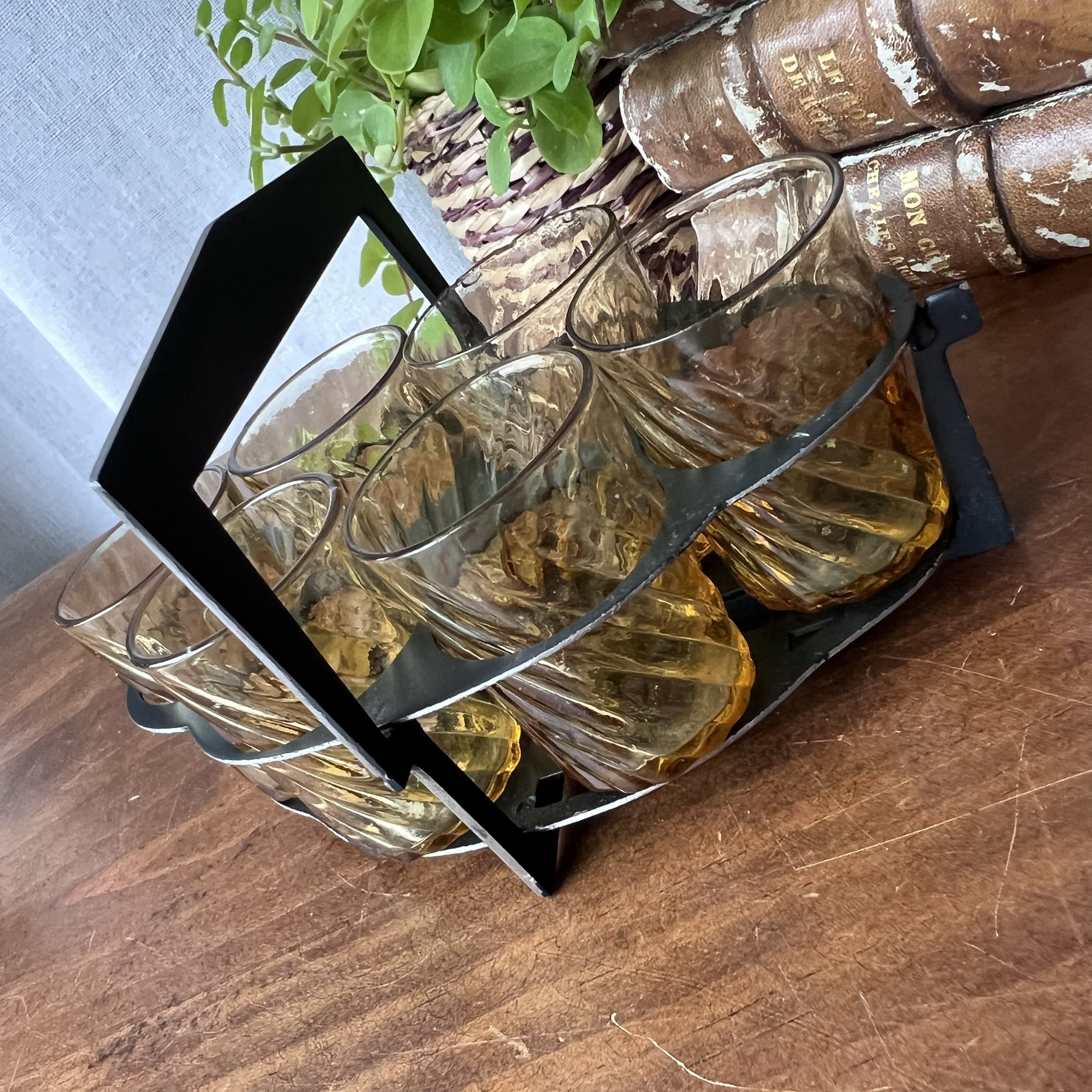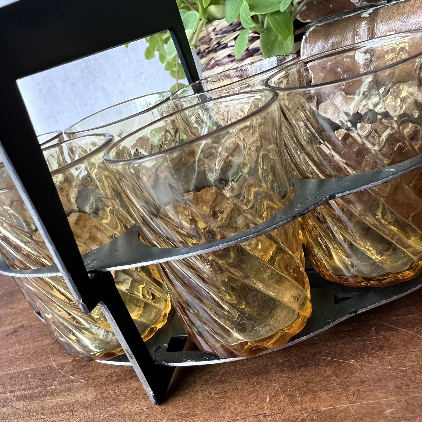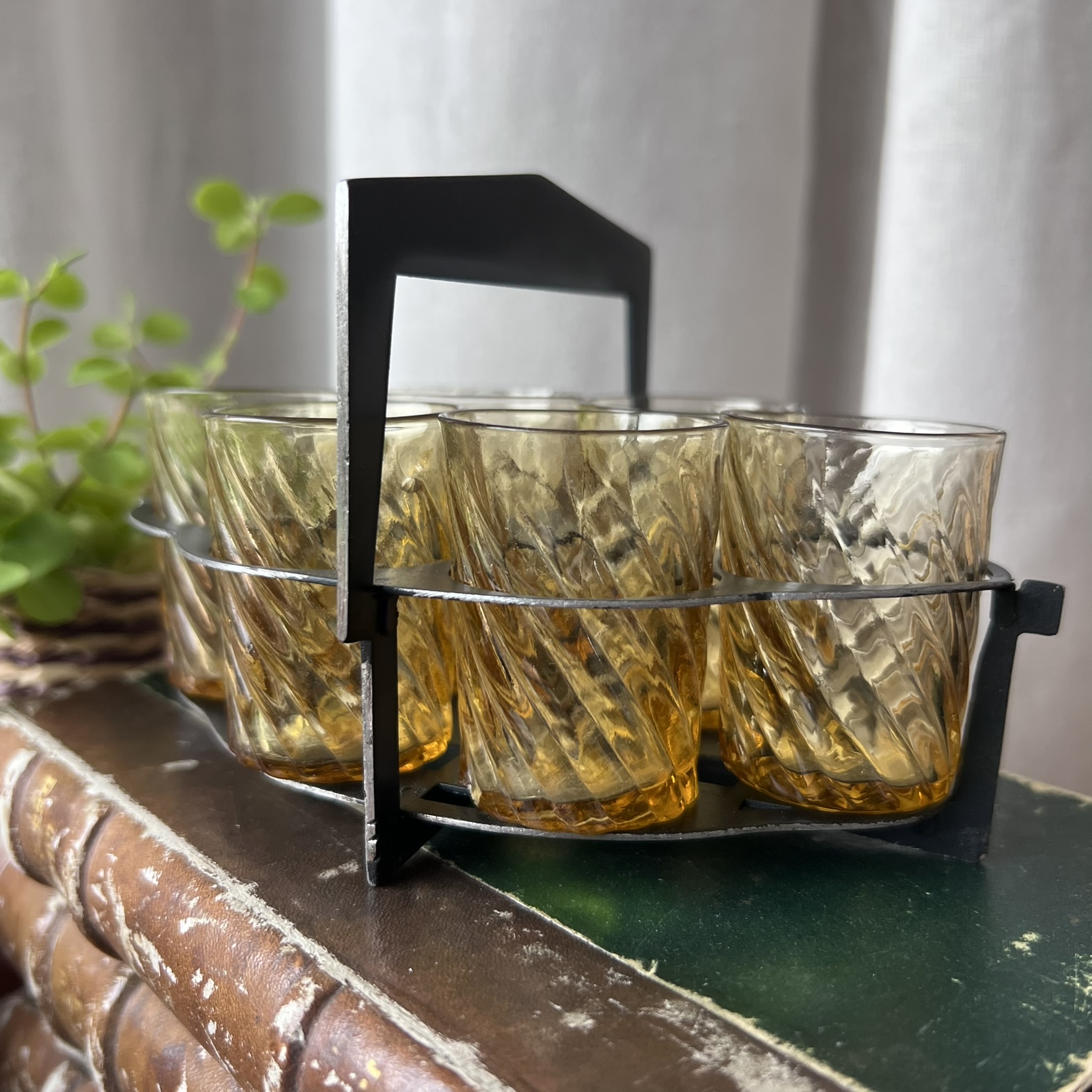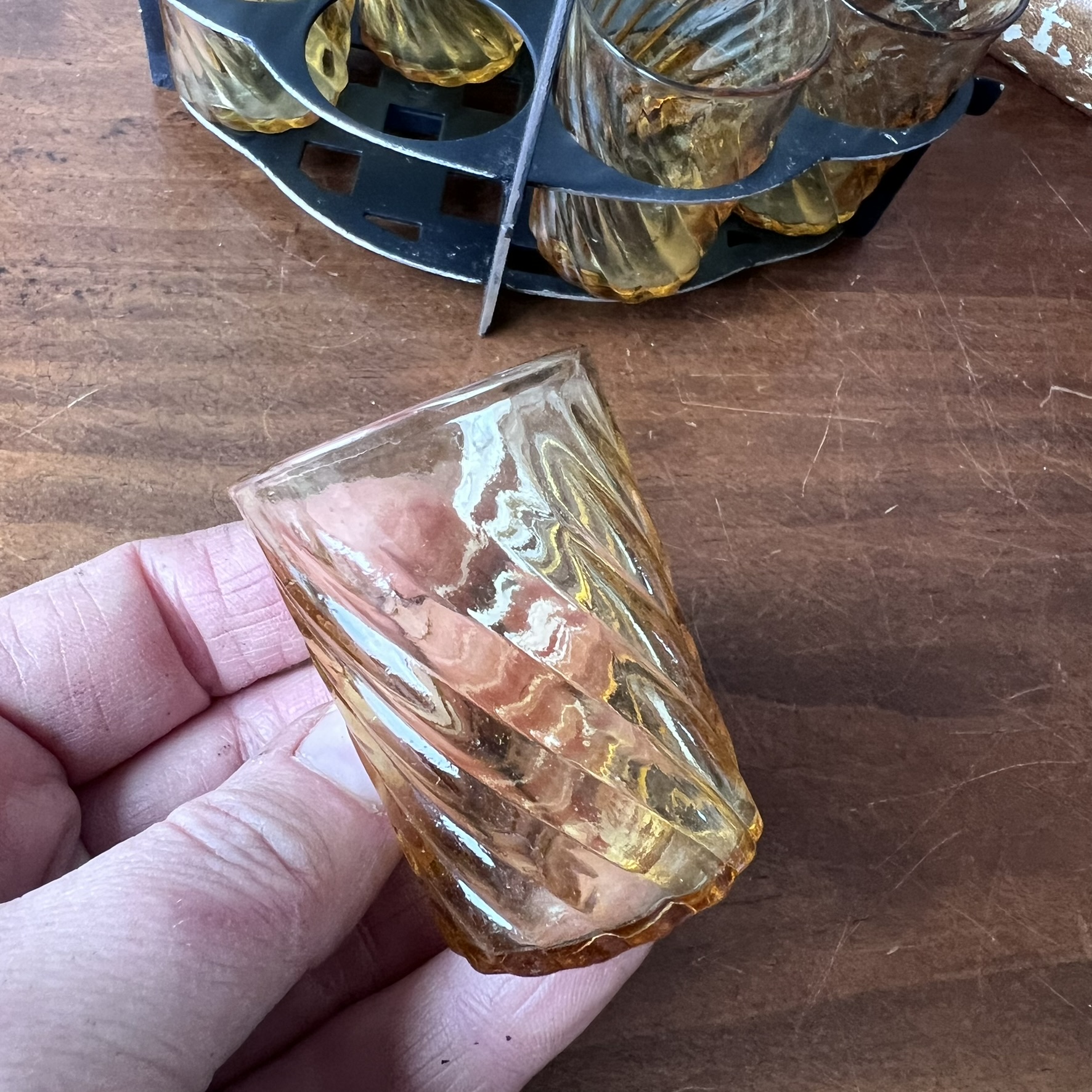 Un petit ensemble qui a le chic des années élégantes. Un support en métal noir patiné. Six petits verres striés, jaune ambré, délicatement lumineux. Deux présentent de légers manques — un à l’encolure, un à la base — rien de coupant, rien de dramatique. Juste la preuve qu’ils ont vécu.