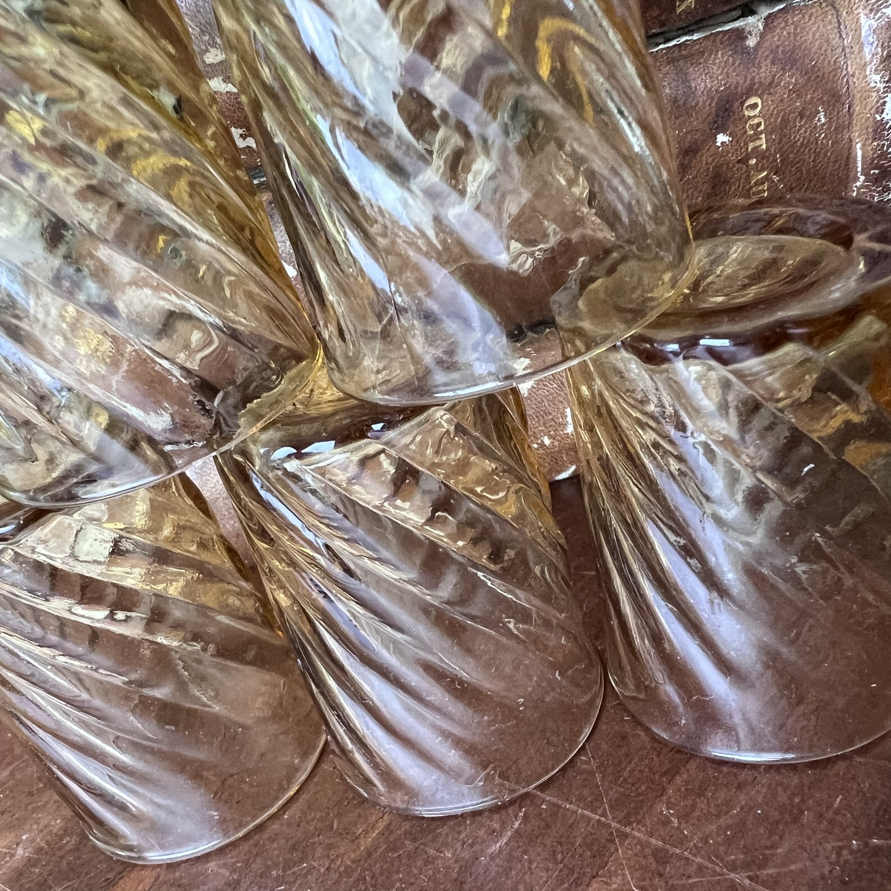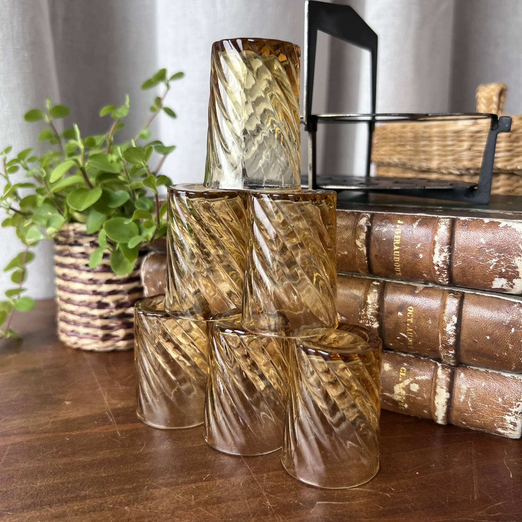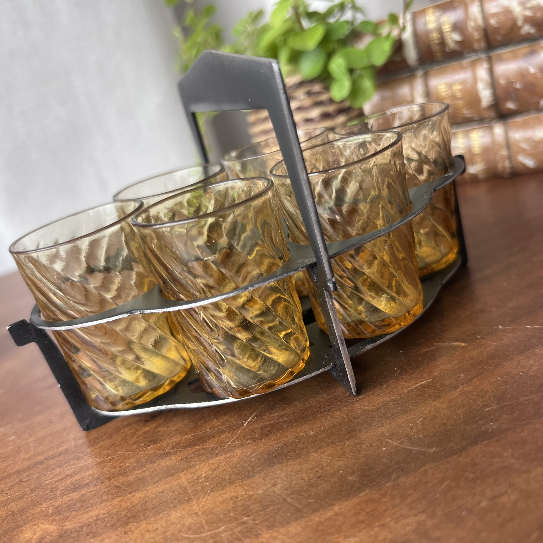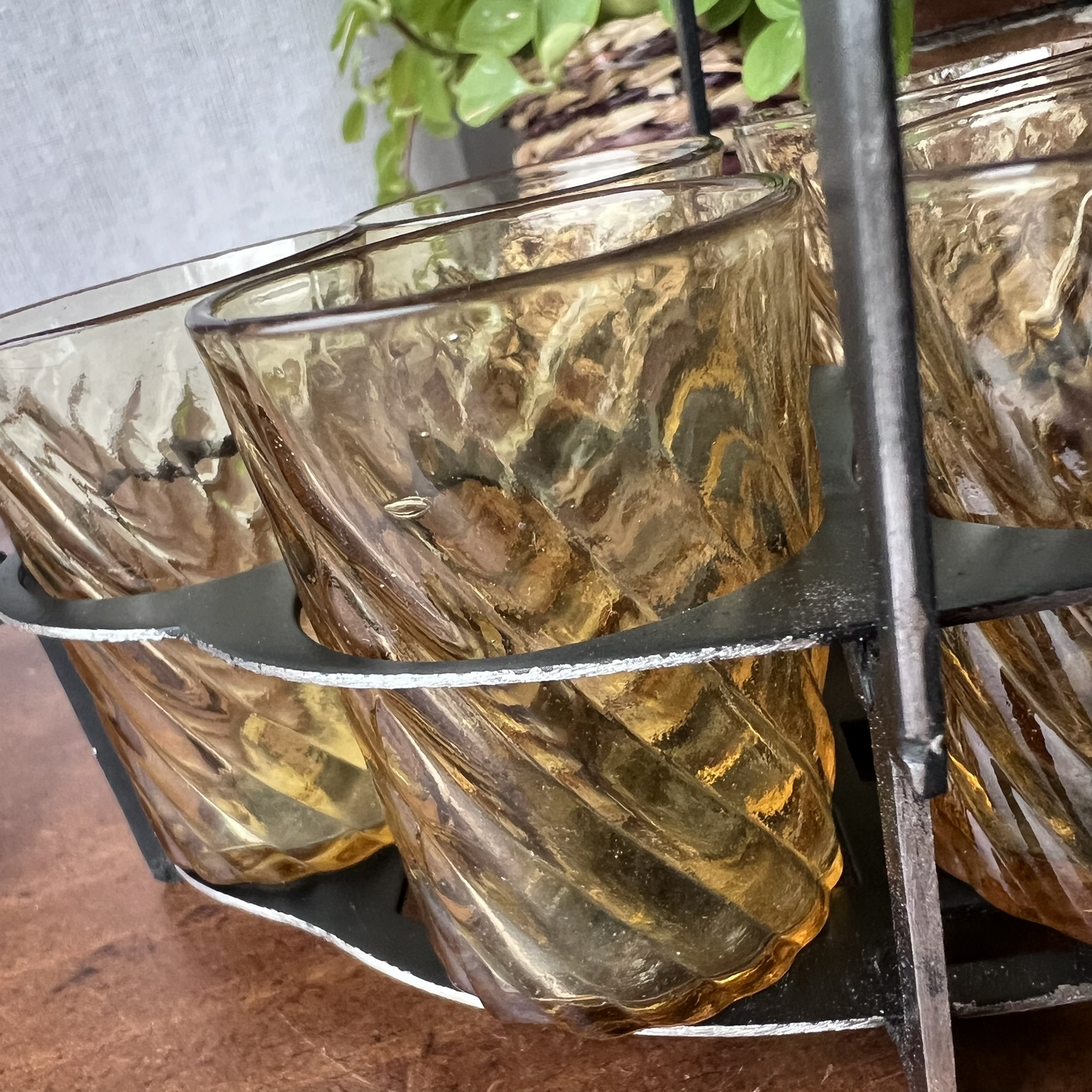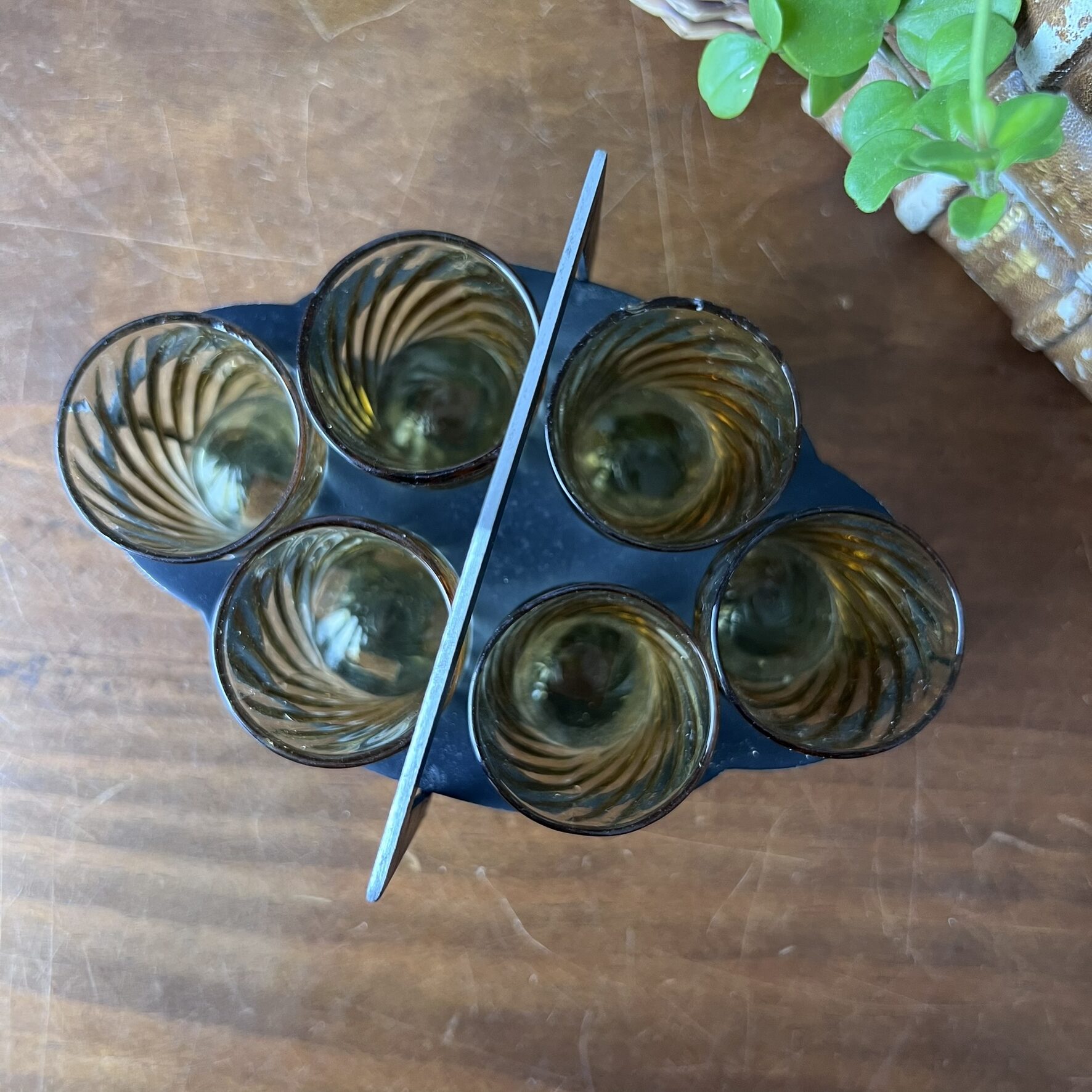 Un petit ensemble qui a le chic des années élégantes. Un support en métal noir patiné. Six petits verres striés, jaune ambré, délicatement lumineux. Deux présentent de légers manques — un à l’encolure, un à la base — rien de coupant, rien de dramatique. Juste la preuve qu’ils ont vécu.