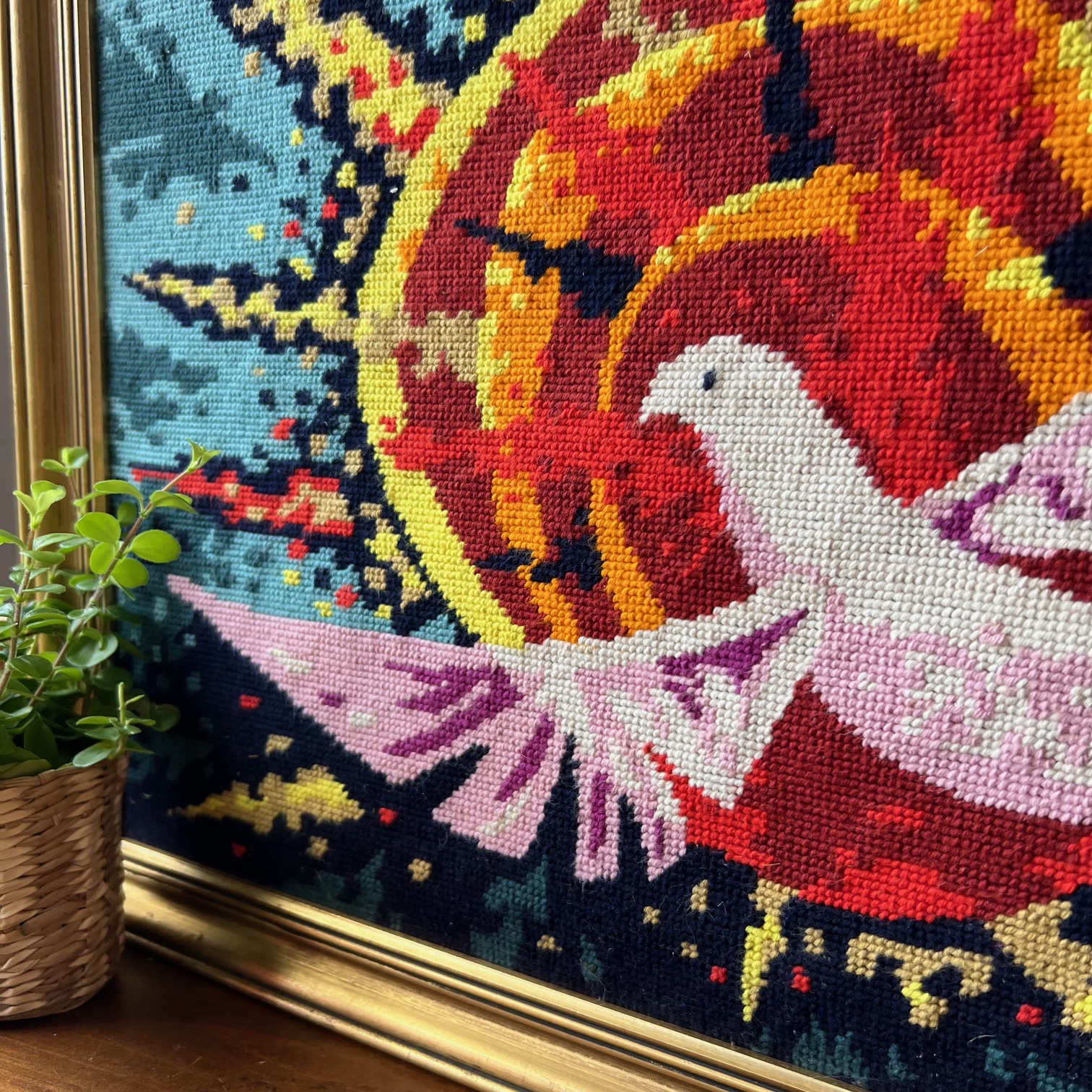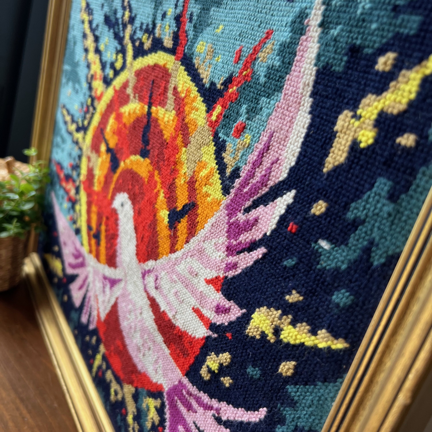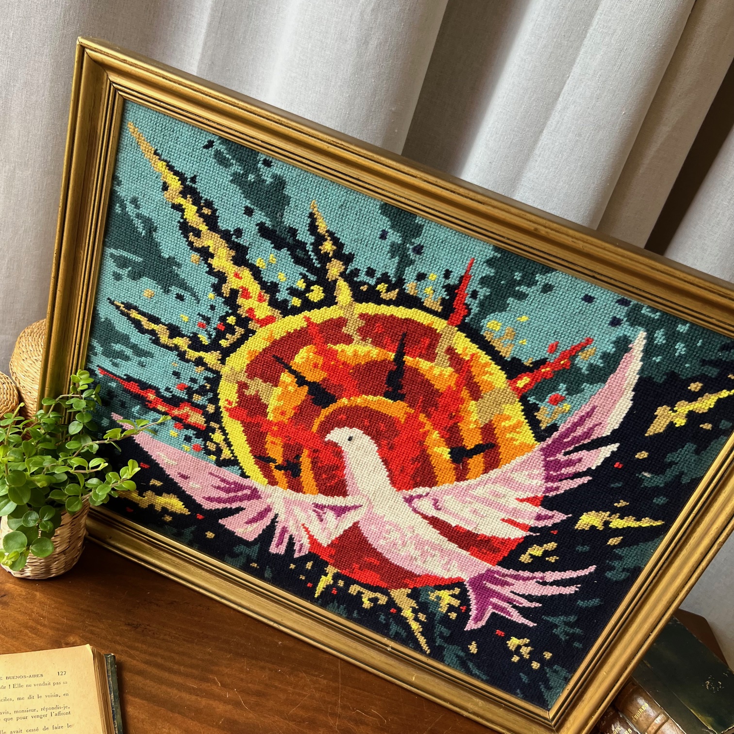 Encadrée dans un cadre doré, cette tapisserie en très bel état capte instantanément le regard : une colombe en plein vol surgit d’une explosion de couleurs incandescentes — rouge, jaune, orange, rose… sur un fond de nuit constellé d’éclats.