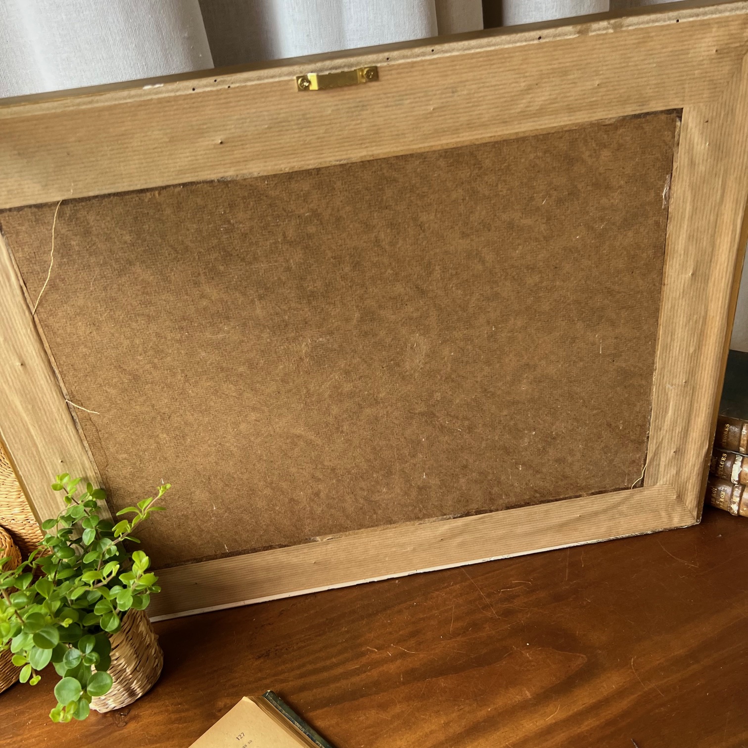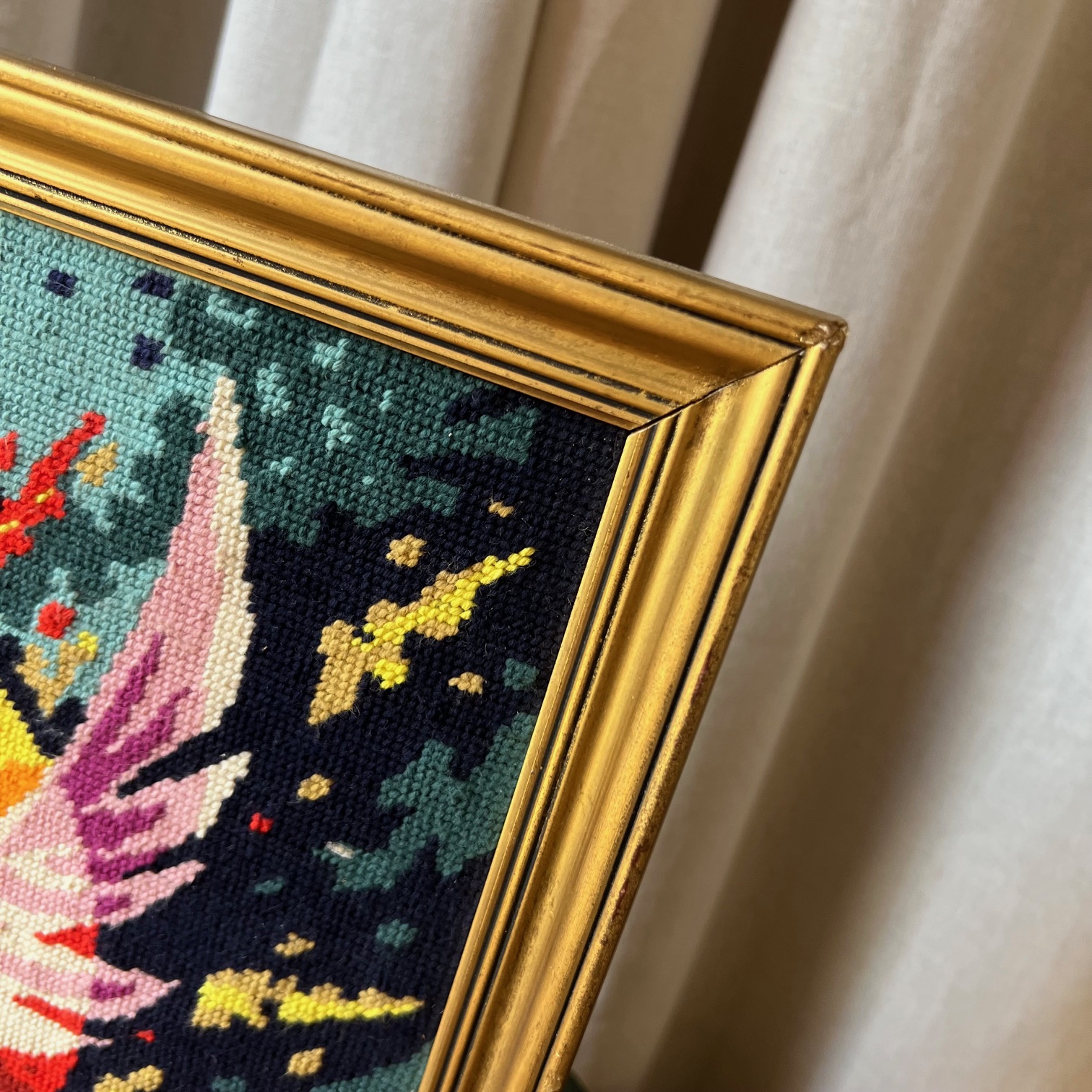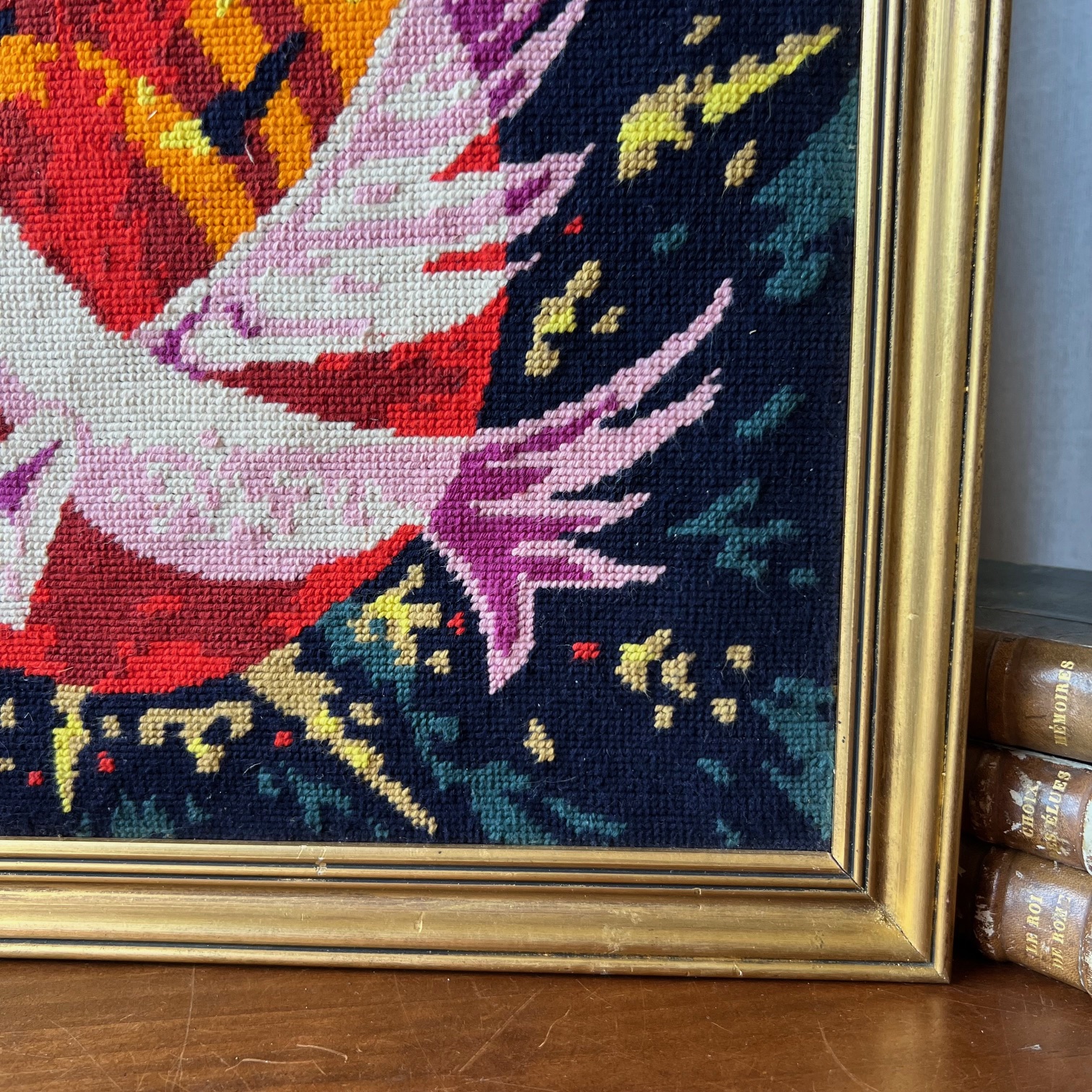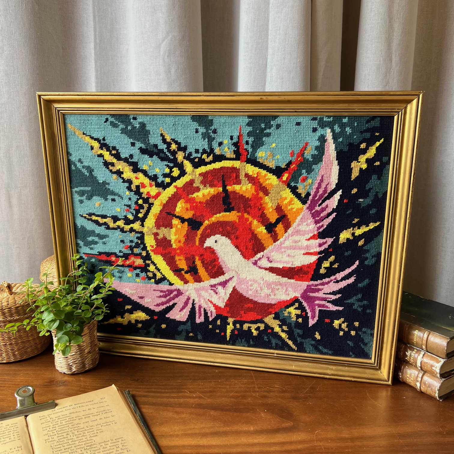 Encadrée dans un cadre doré, cette tapisserie en très bel état capte instantanément le regard : une colombe en plein vol surgit d’une explosion de couleurs incandescentes — rouge, jaune, orange, rose… sur un fond de nuit constellé d’éclats.