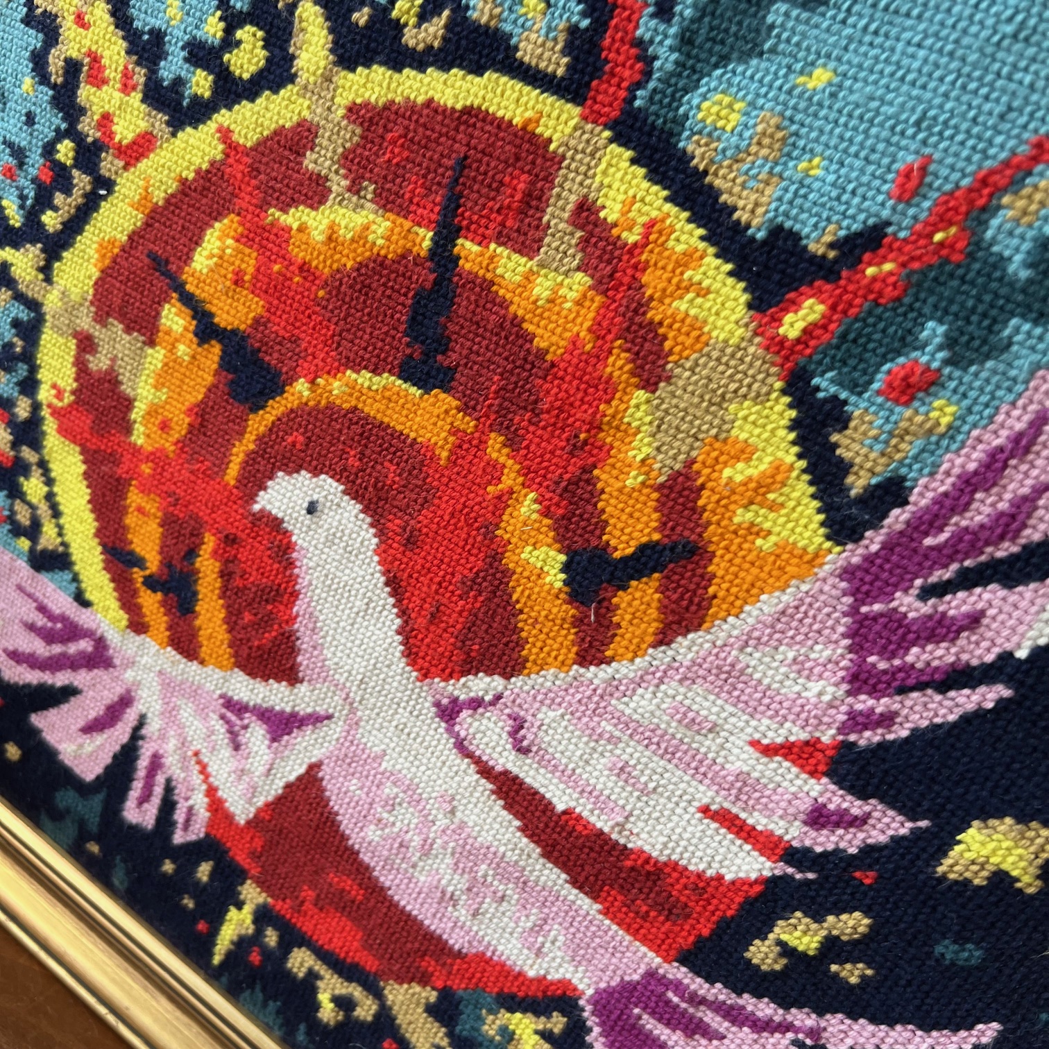 #tapisserievintage #colombe #symbolismepacifique #tissuart #canevasancien #broderieartistique #arttextile #decoeclectique #artvintage #mavaliseencarton #brocantedeco #peaceandlove