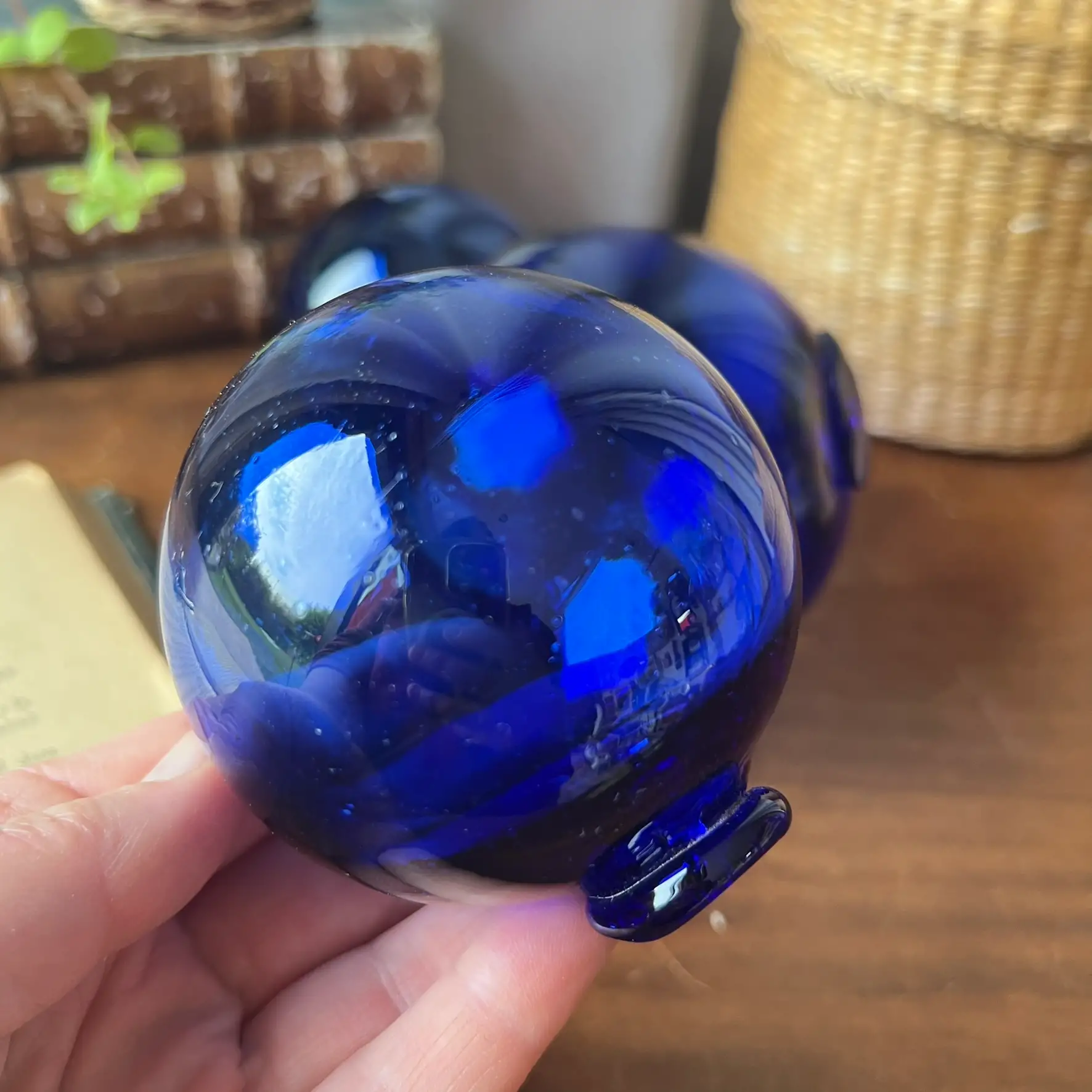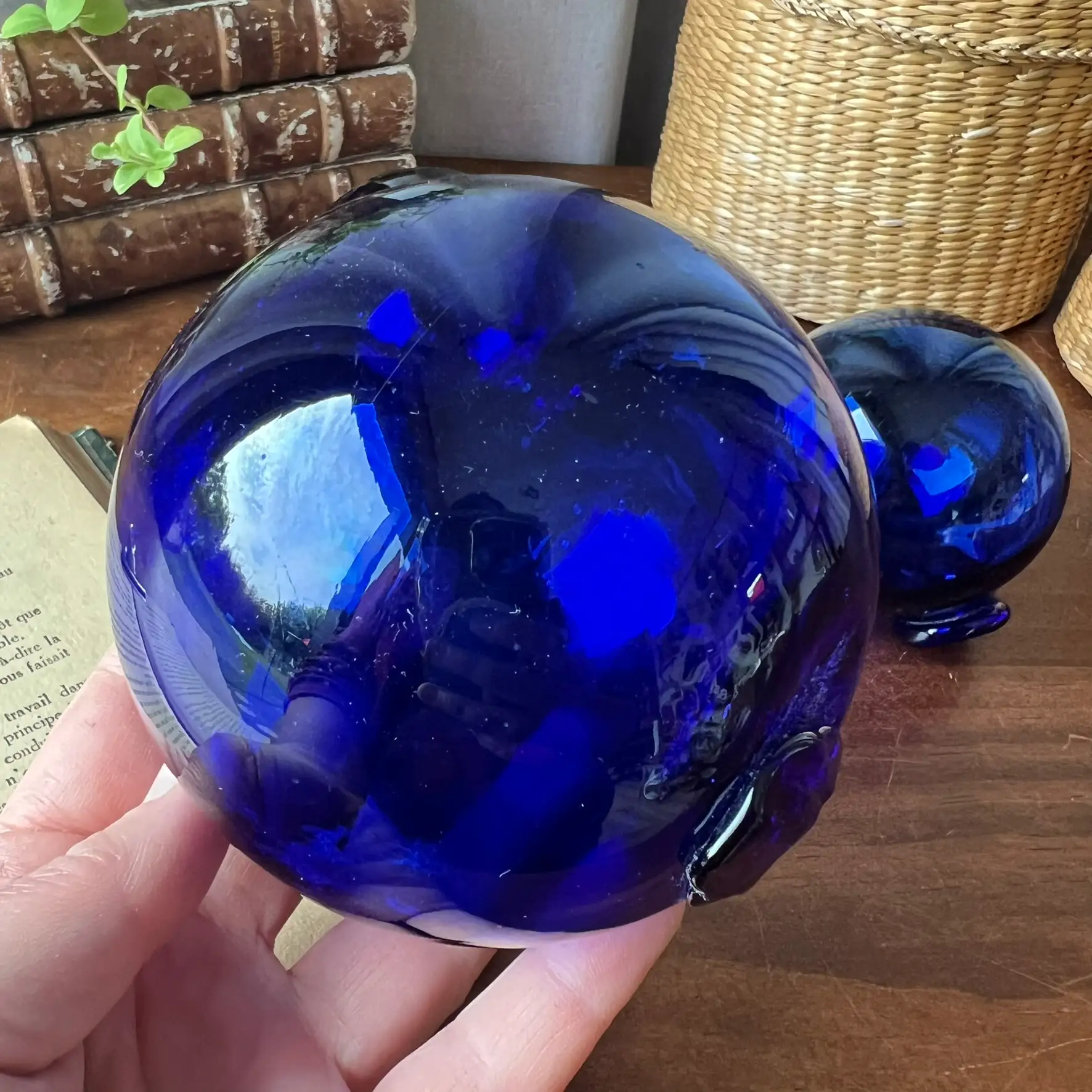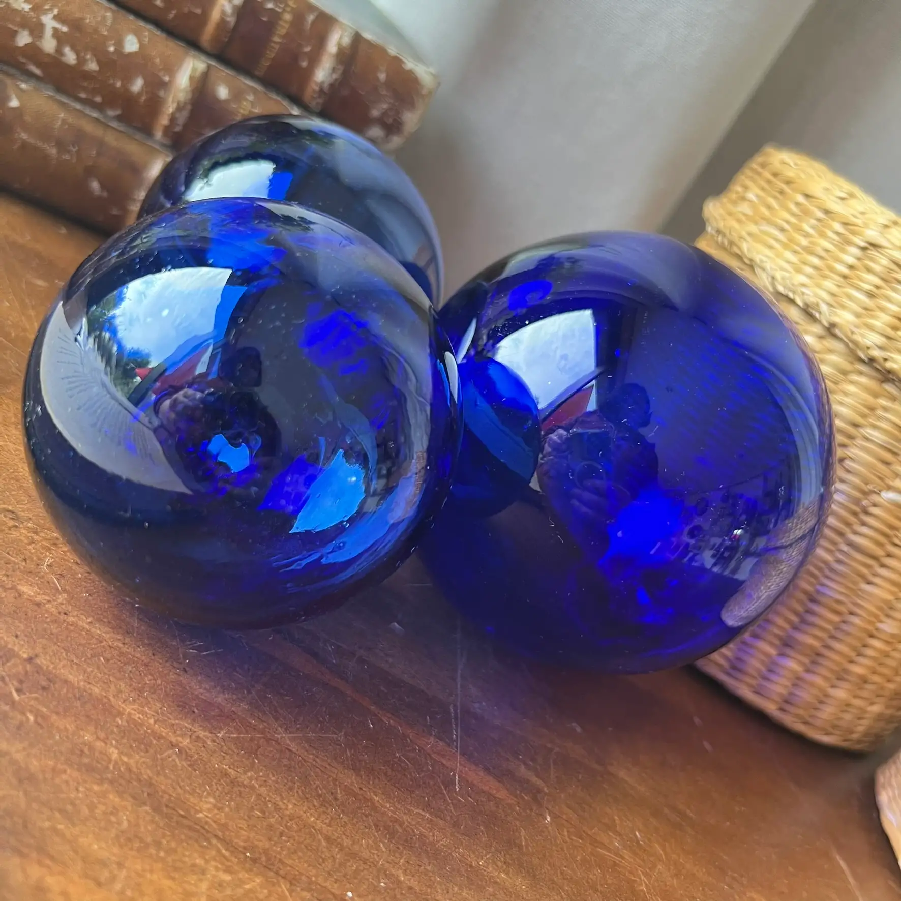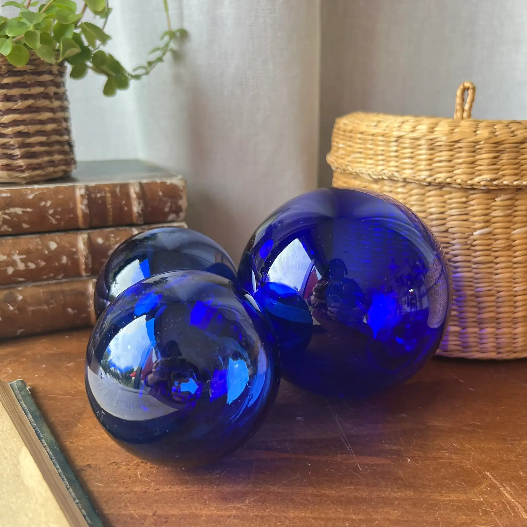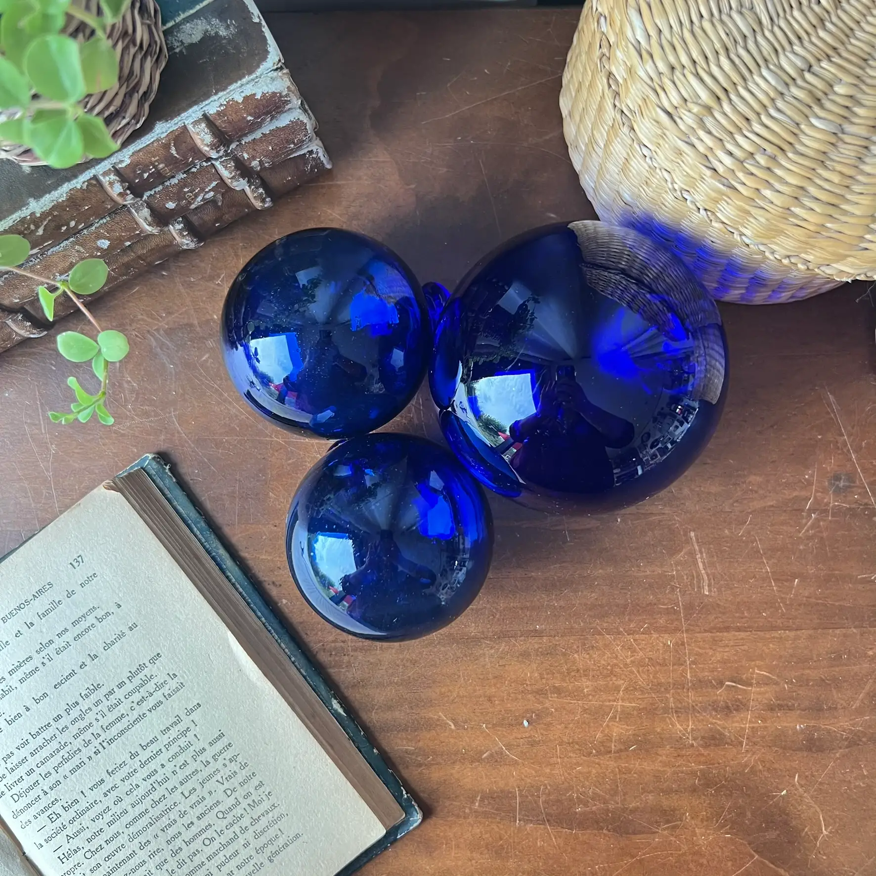 Ces trois boules en verre bleu captent la lumière d’une façon magnifique. Leur couleur profonde change selon l’heure de la journée, et c’est justement ce qui les rend si belles.