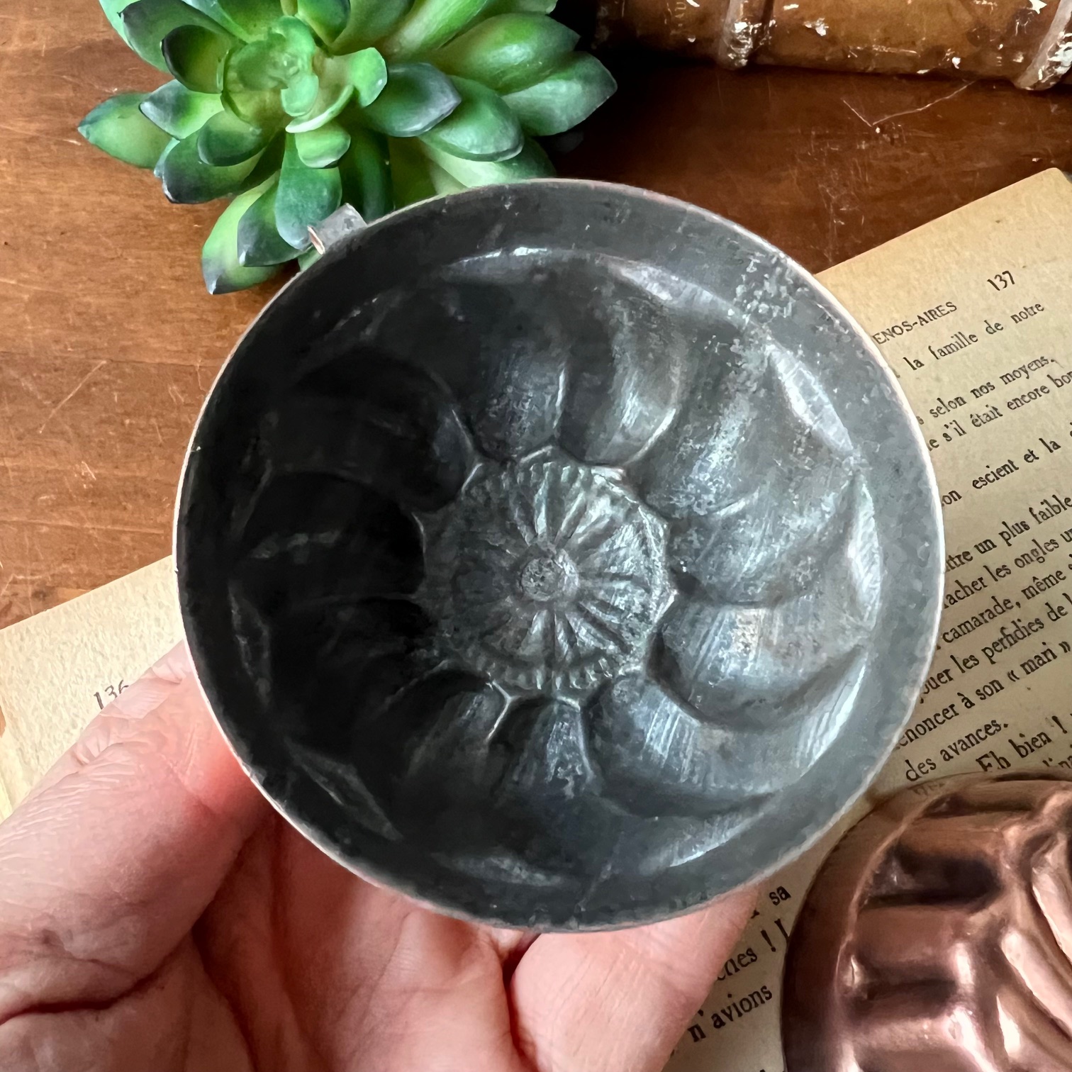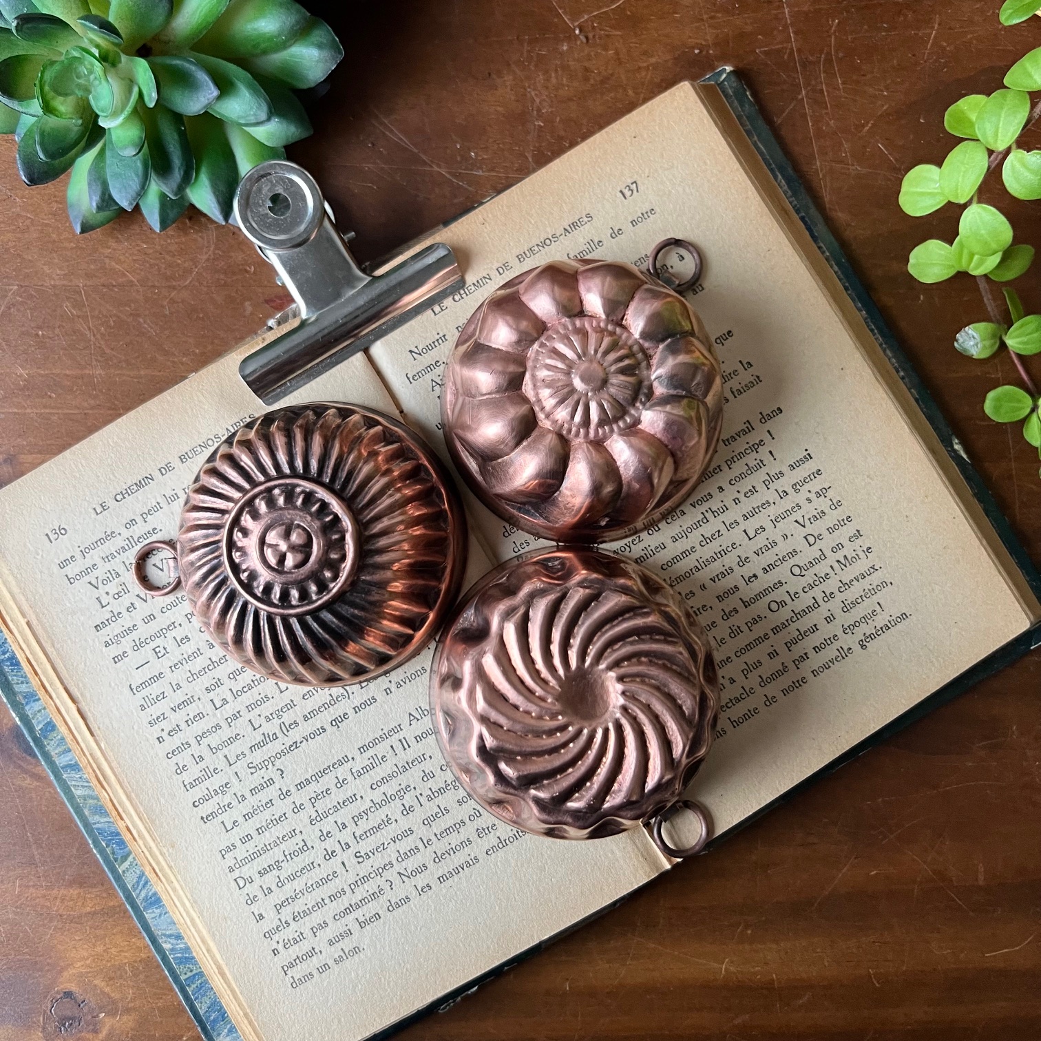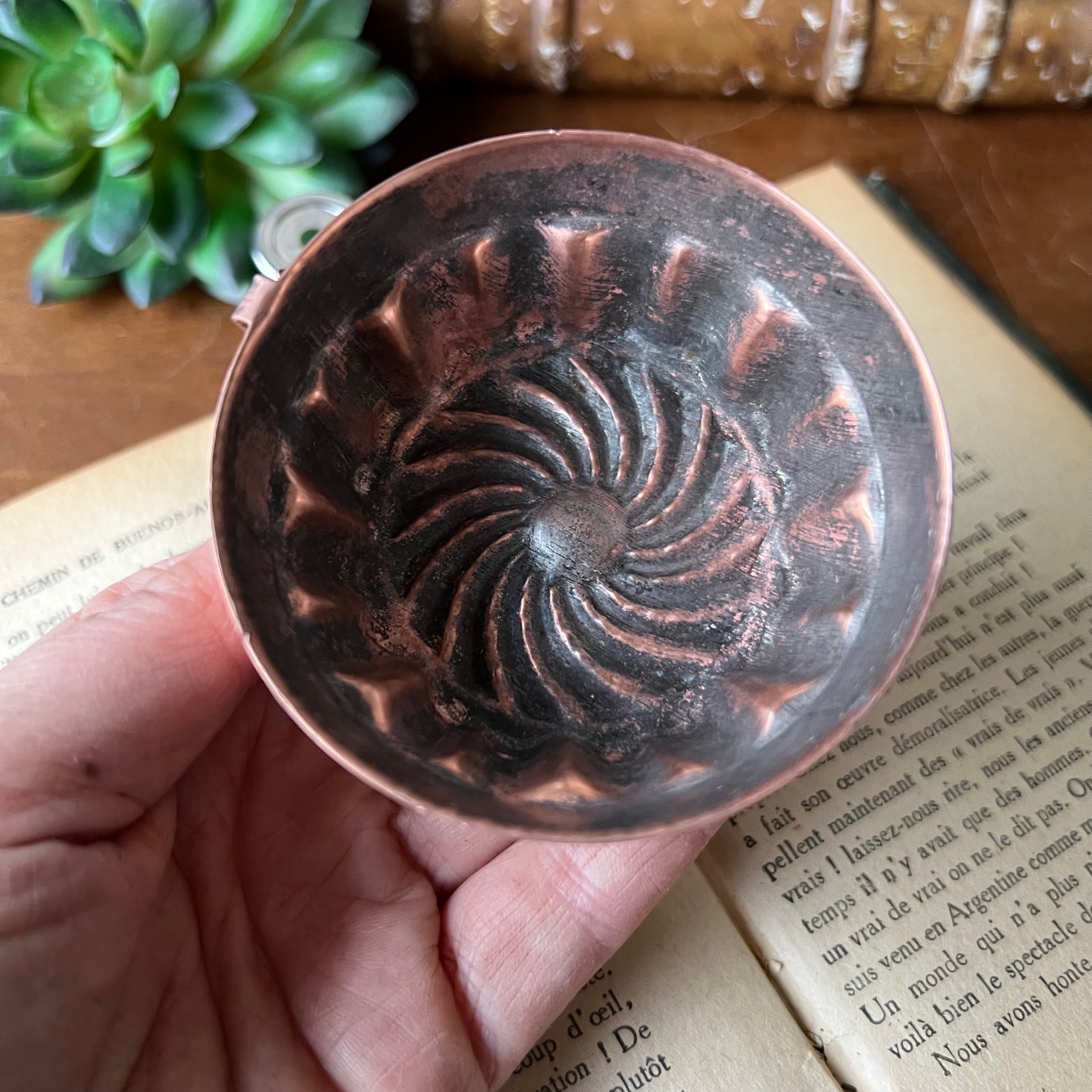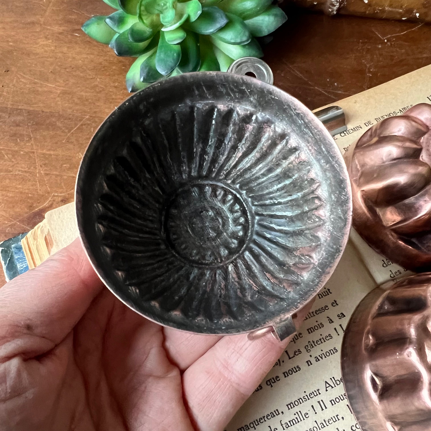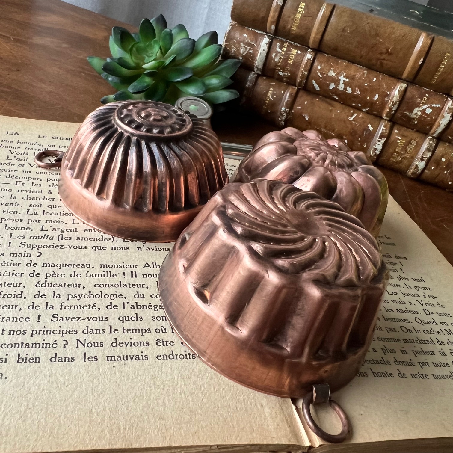 Comment ne pas craquer pour ces mini moules en cuivre ? On les aime autant en déco qu’en pâtisserie. En bel état, jolie patine. Boucle d’accroche.
