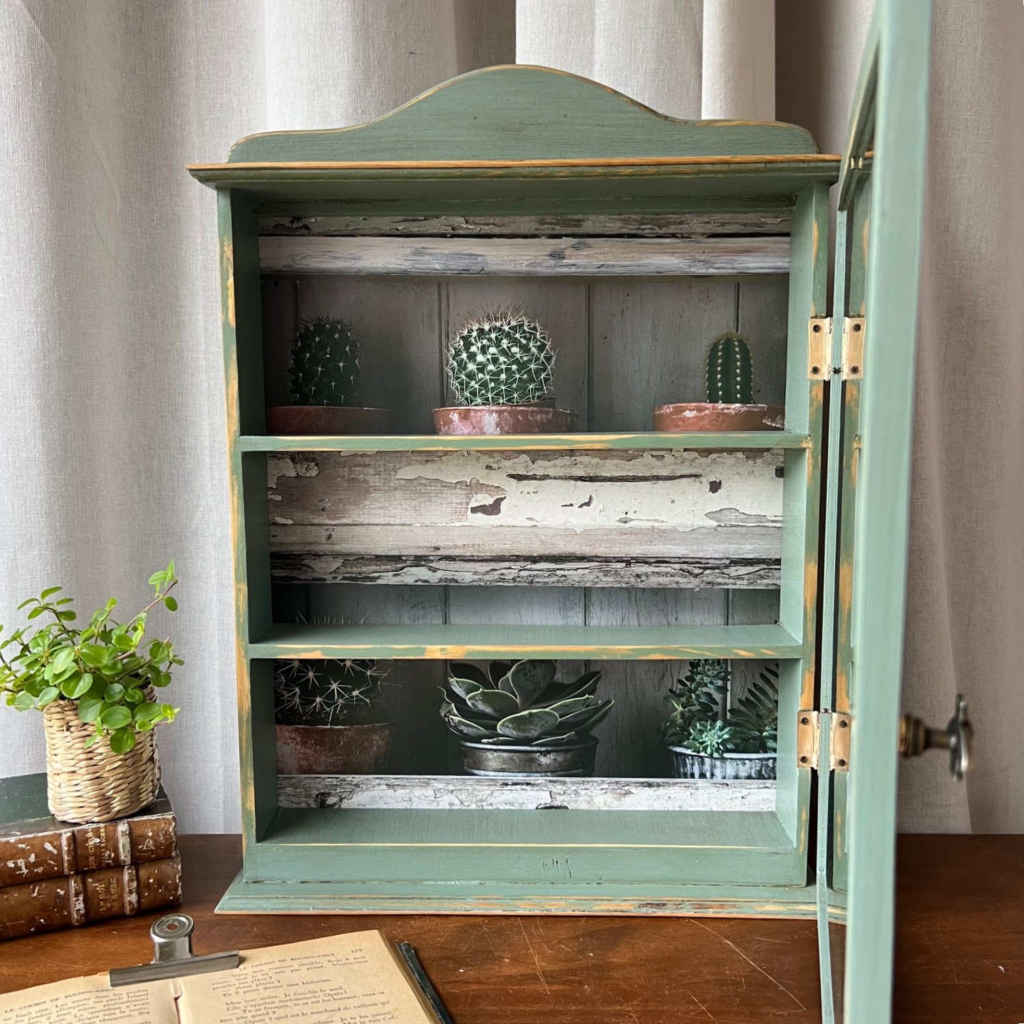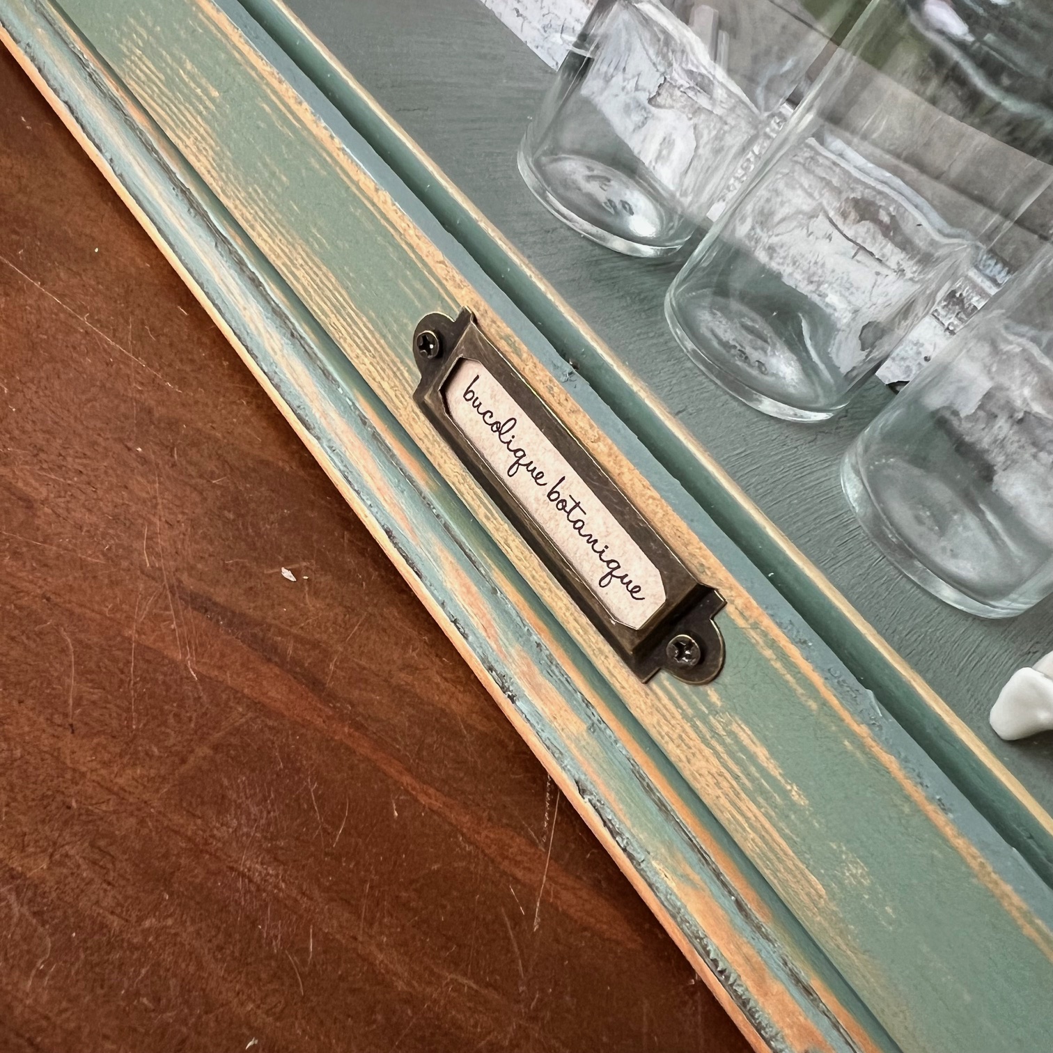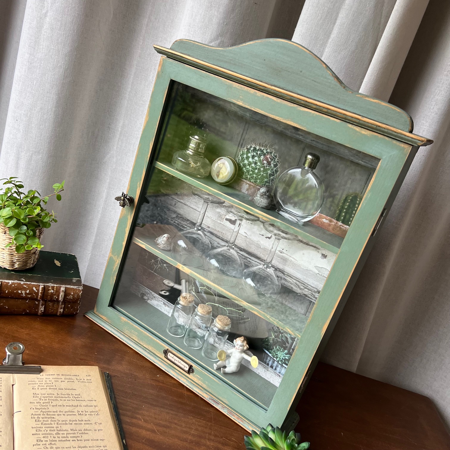 Une petite vitrine à l’allure bucolique, teintée d’un bleu-vert doux comme une matinée de printemps. Le bois a retrouvé son charme grâce à une patine volontairement usée, laissant entrevoir ce qu’il a été.