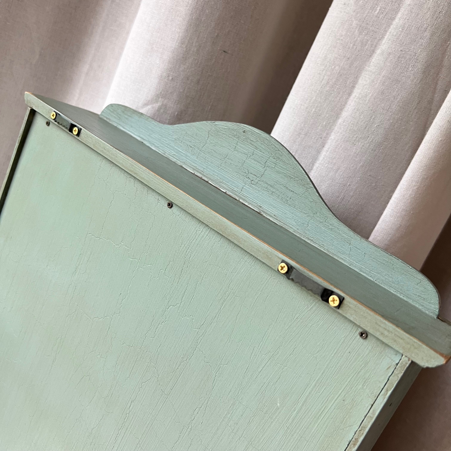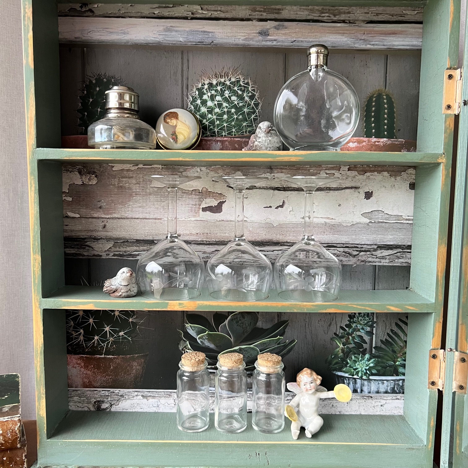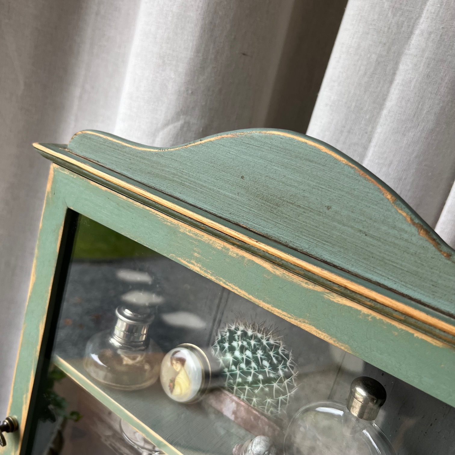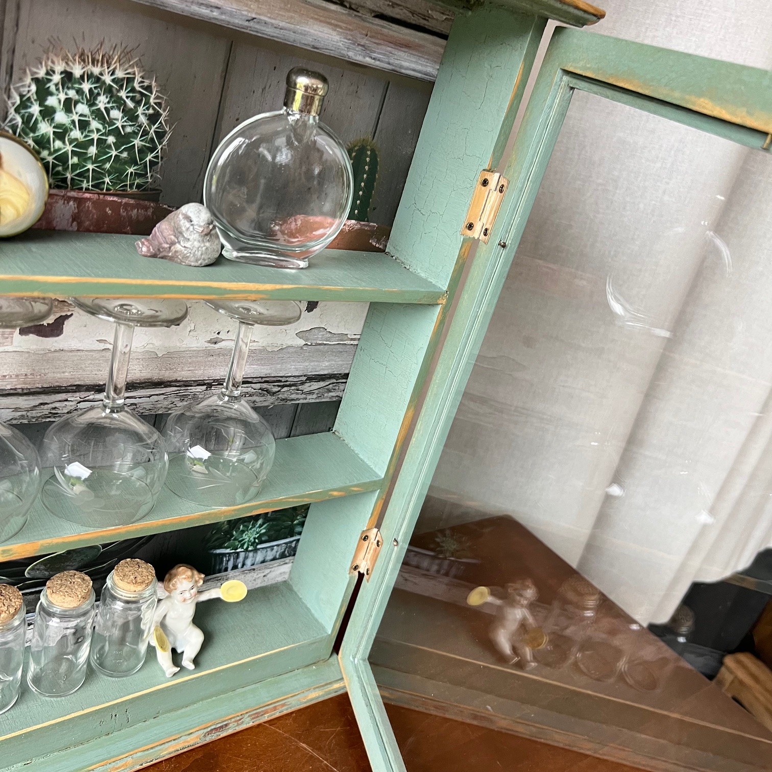 Une petite vitrine à l’allure bucolique, teintée d’un bleu-vert doux comme une matinée de printemps. Le bois a retrouvé son charme grâce à une patine volontairement usée, laissant entrevoir ce qu’il a été.