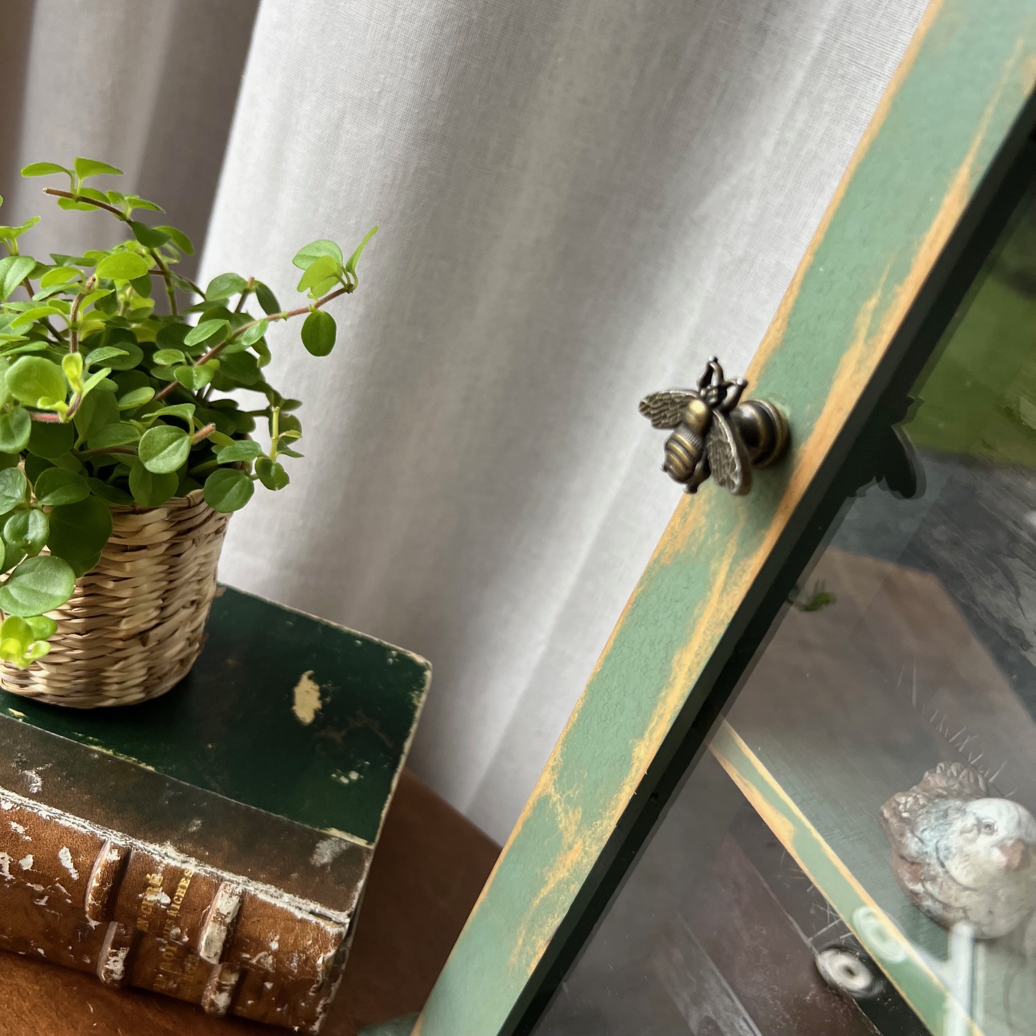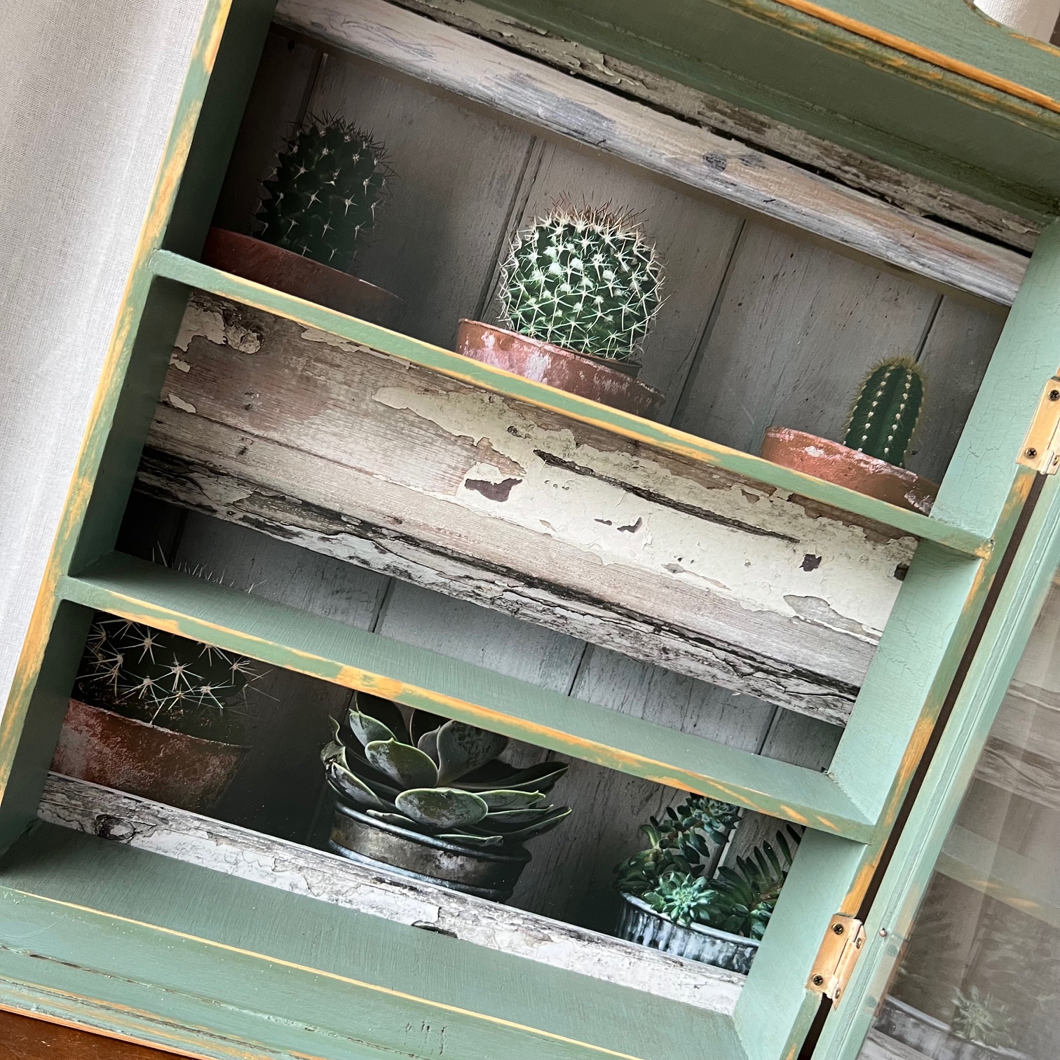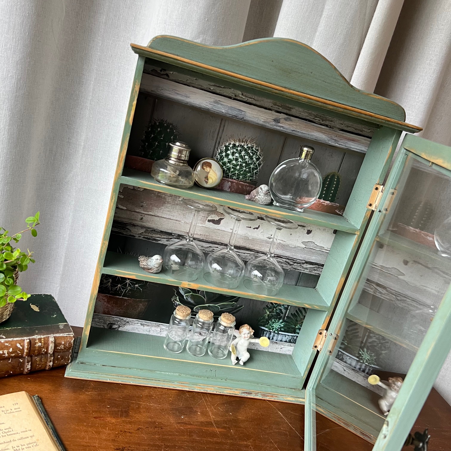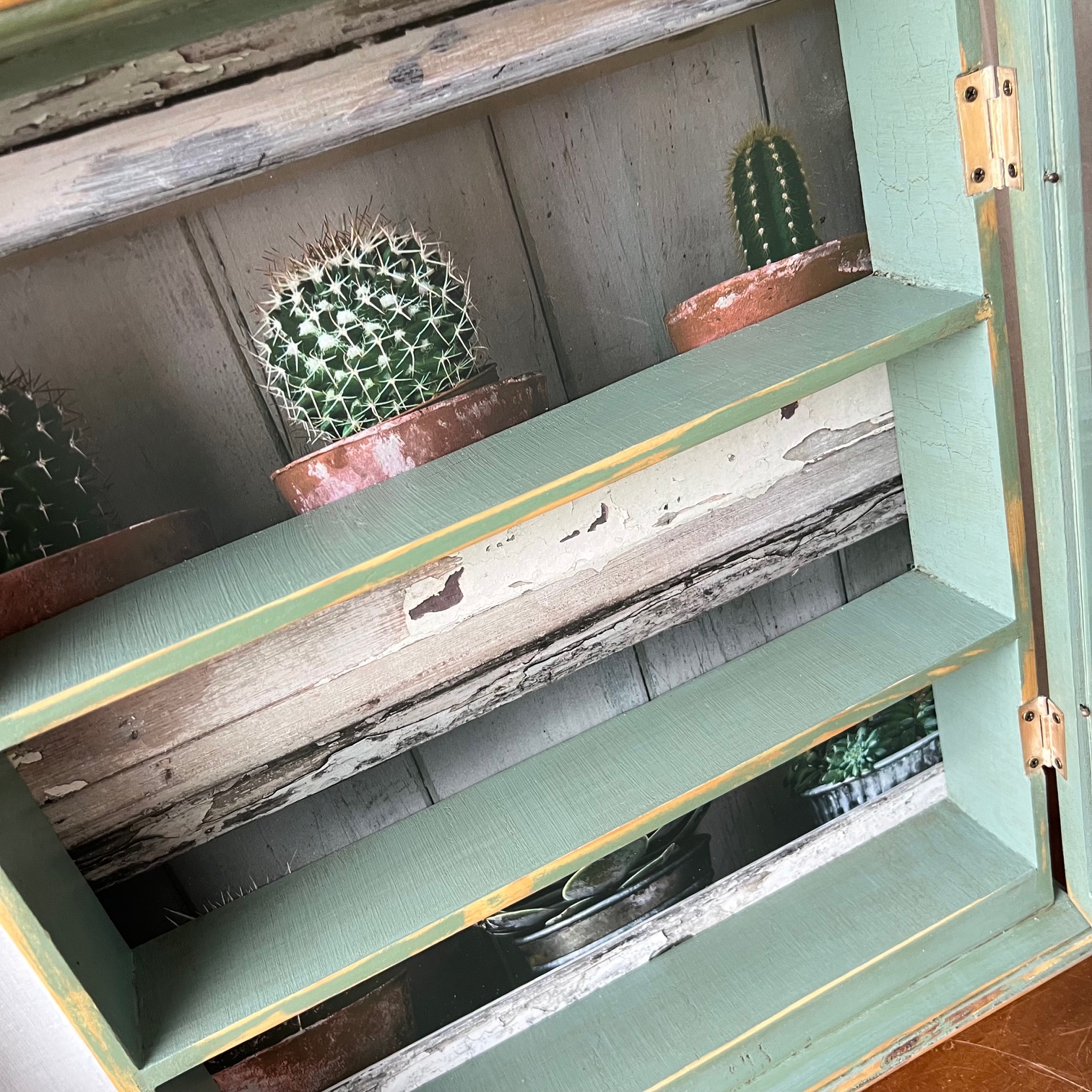 Derrière la vitre d’origine, quelques flacons, souvenirs ou curiosités trouveront refuge. En fond, un décor de cactées évoque un jardin miniature, suspendu dans le temps. Et comme un clin d’œil, un petit bouton en forme d’abeille veille sur ce petit monde botanique.